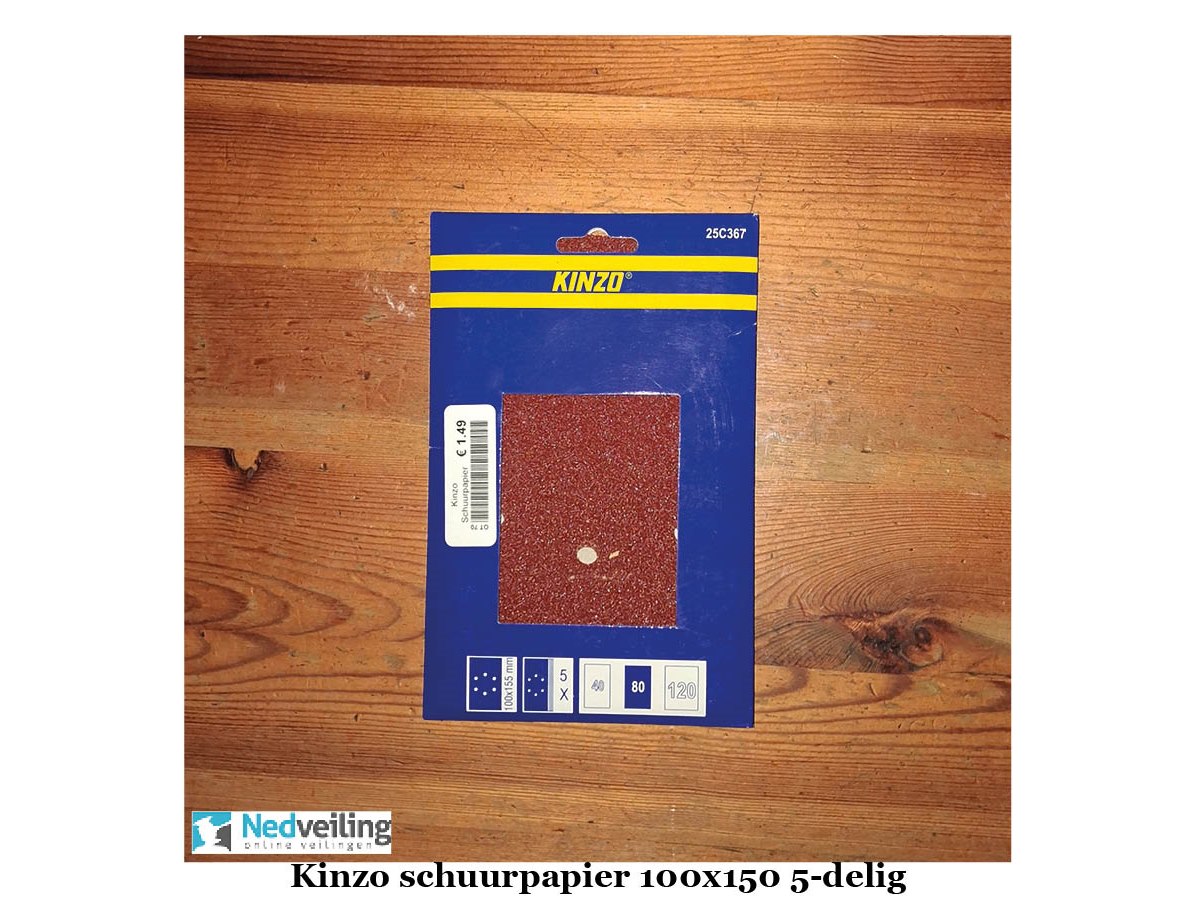 6 verpakkingen Kinzo schuurpapier 100x150 mm 5 vel korrel 40 Staat: Nieuw Verzendgewicht: 0.35 Kg.