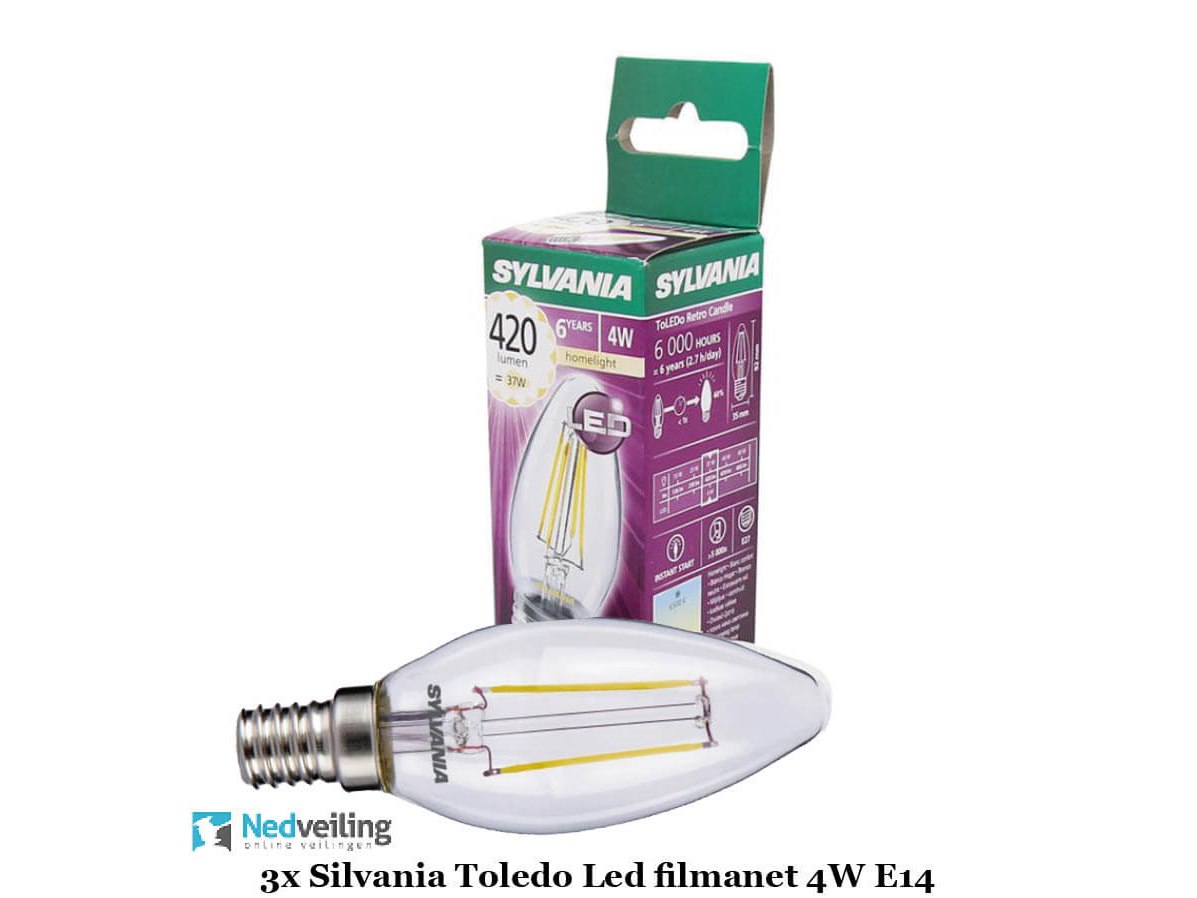 3x Sylvania Toledo filament Led kaarslamp E27 4W (wvp 5,95 p/st) Staat: Nieuw Verzendgewicht: 0.20 Kg.