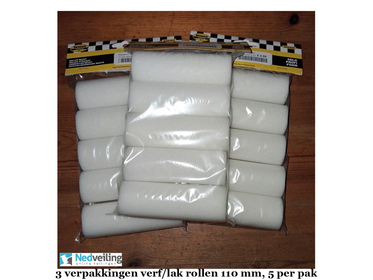3 verpakkingen verf/lak rollen 110 mm 5 per pak Staat: Nieuw Verzendgewicht: 0.30 Kg.