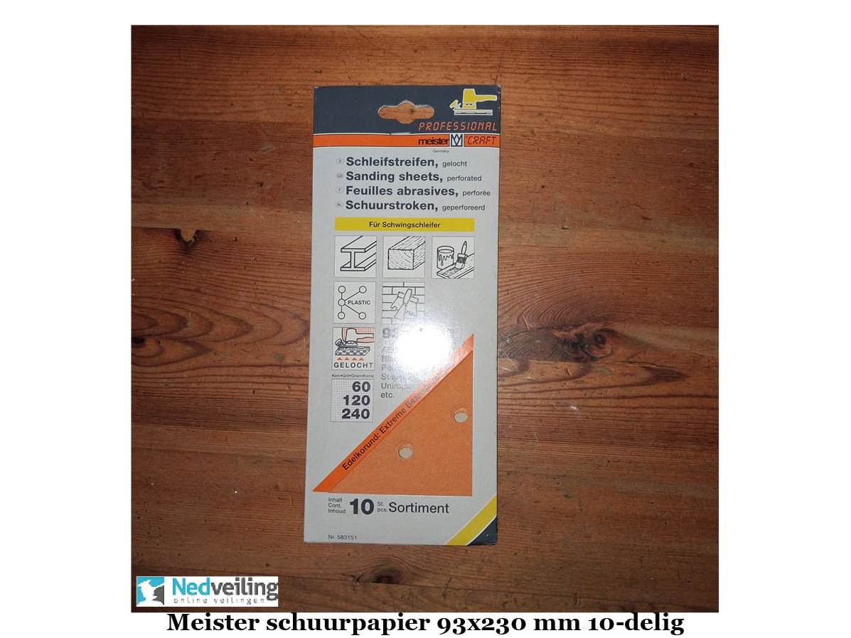 10 verpakkingen Meister schuurpapier div korrel à 10 vel Staat: Nieuw Verzendgewicht: 1.00 Kg.