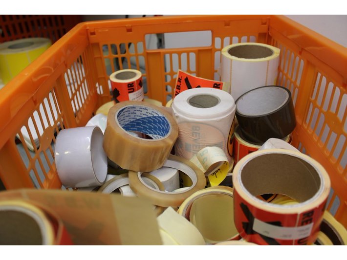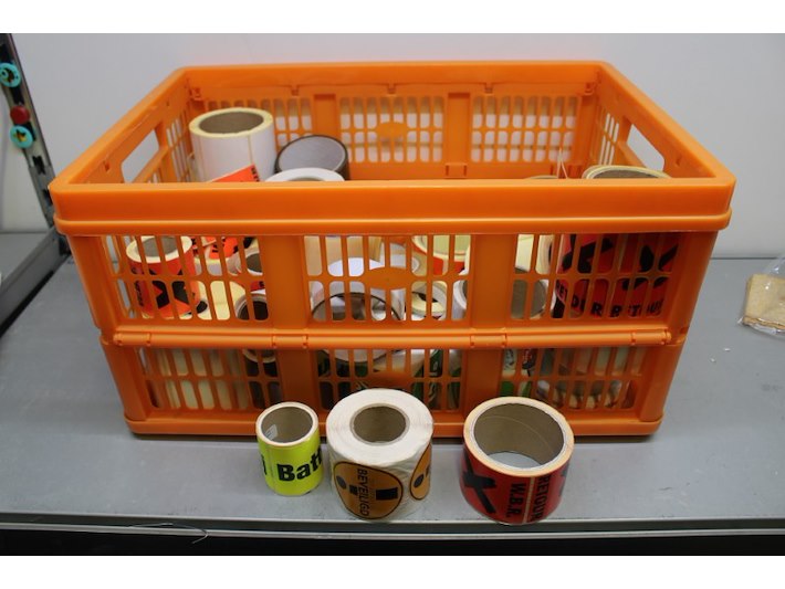 Partij magazijn stickers divers, incl krat Staat: Nieuw Verzendgewicht: 3.00 Kg.