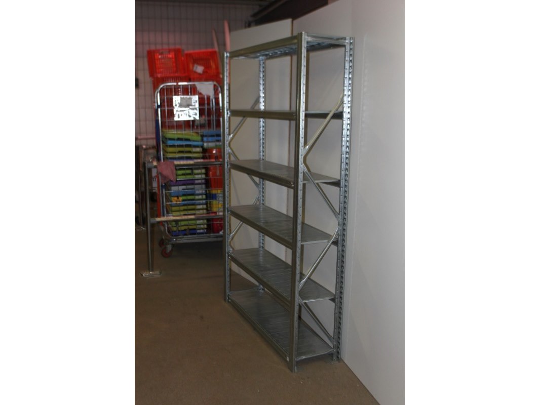 Legbord stelling, planken 30 cm diep x 120 cm breed, staanders 200 cm hoog. 24 meter stelling met 21 staanders. Staat: Gebruikt Verzendgewicht: Deze kavel kan niet worden verzonden!