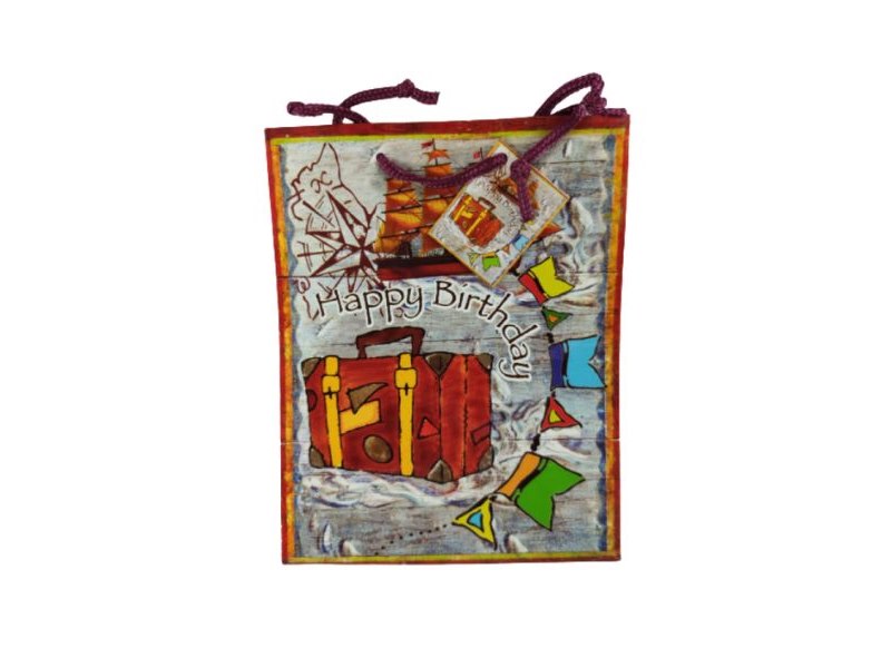 60 x Kadotasje “Happy Birthday”, Kadotasje “Happy Birthday” papier; buitenkant geplastificeerd Aan het koord is een klein kaartje bevestigd met dezelfde afbeelding. Afmeting: 18 x 22,5cm. Leverbaar in 4 kleuren, wordt in assorti geleverd Staat: Nieuw Verzendgewicht: 2.00 Kg.