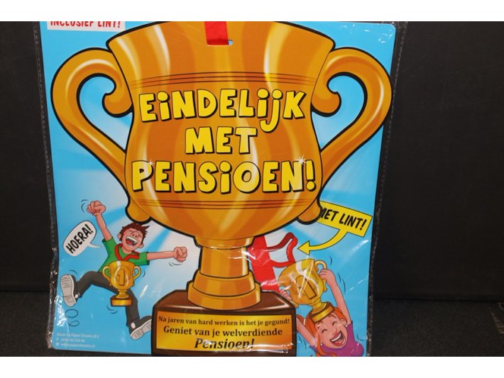 Ik ben met pansioen beker met lint in KR 15, Staat: Nieuw Verzendgewicht: 1.00 Kg.