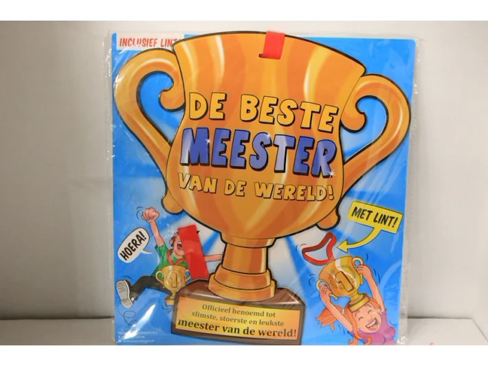 2x Trofee met lint en tekst Beste meester in ds 49 Staat: Nieuw Verzendgewicht: 0.20 Kg.