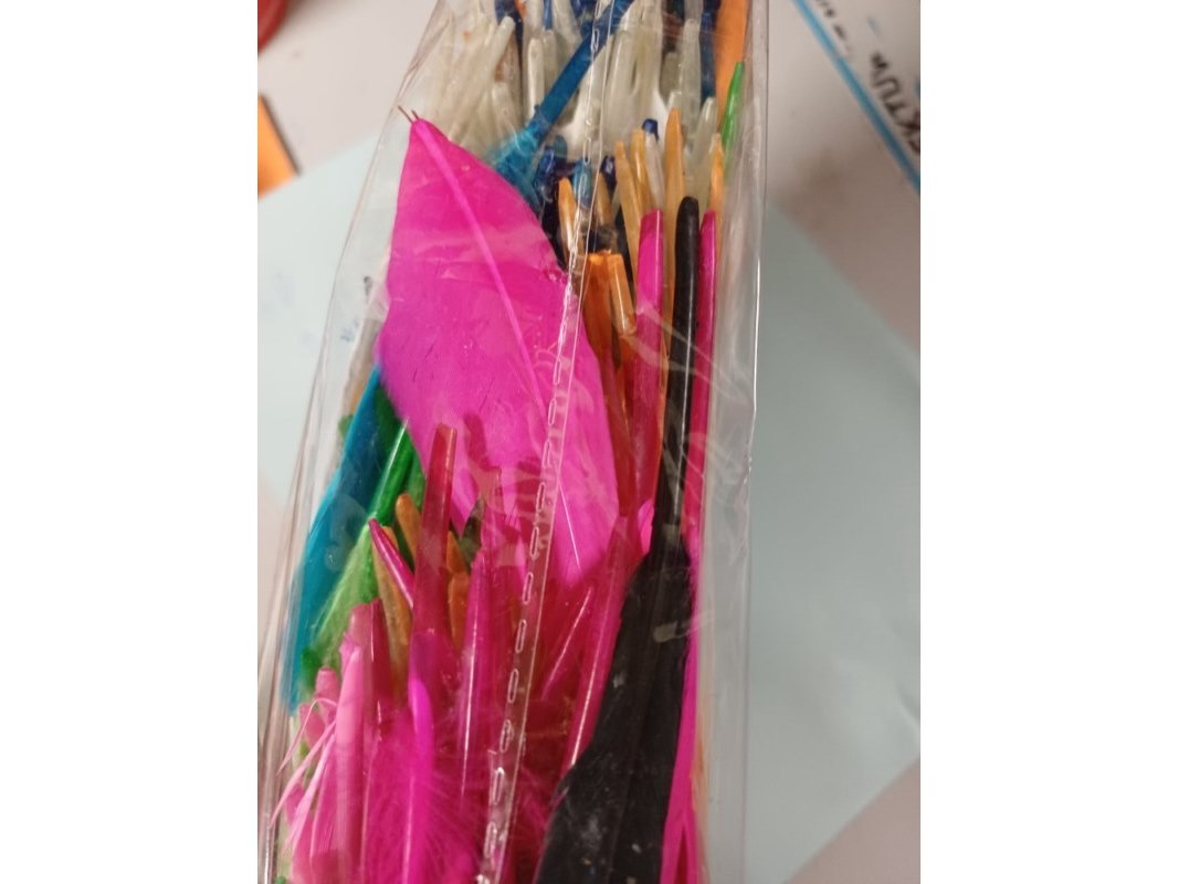 Gekleurde veertjes zak a 100 stuks 50 zakjes , Staat: Nieuw Verzendgewicht: 2.00 Kg.