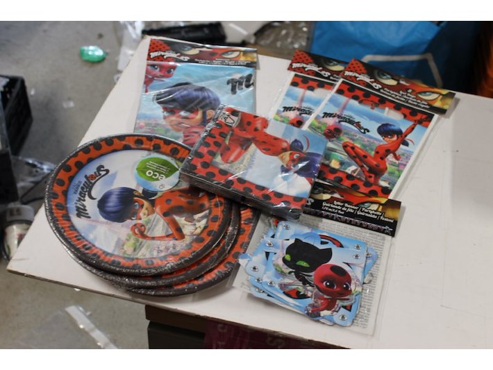 Feestset Miraculous, 16 uitdeelzakjes, 20 servetten, 1 slinger, 24 bordjes, 1 tafelkleed Staat: Nieuw Verzendgewicht: 0.50 Kg.