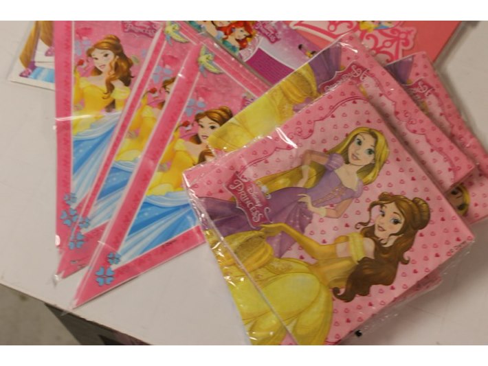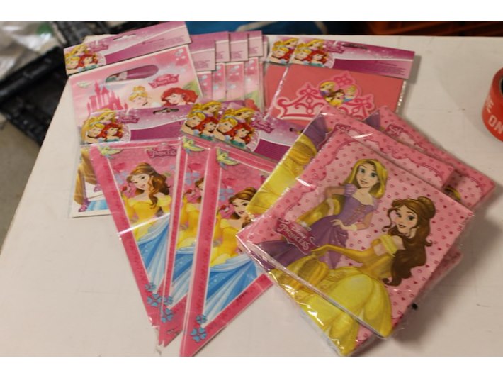 Feestset Princessen, 12 uitnodigingen, 24 uitdeelzakjes, 20 servetten, 1 banner, 6 balonnen Staat: Nieuw Verzendgewicht: 0.50 Kg.