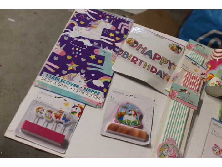 Feestset Paarden/Unicorn, 48 rietjes, 1 kaars, 1 kaarsenset, 40 servetten, 8 bekers, 1 banner, 1 tafelkleed Staat: Nieuw Verzendgewicht: 0.50 Kg.