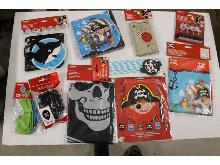 Feestset Piraat, 1 tafelkleed, 1 vlaggenlijn, 1 slinger, 20servetten, 8 rietjes,1 vlag groot, 8 uitnodigingen, 4 kaarsjes, 14 ballonnen Staat: Nieuw Verzendgewicht: 0.50 Kg.