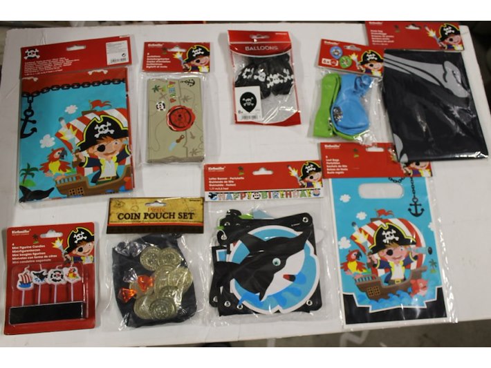 Feestset Piraat, restpartij, 1 coin pouch set, 8 kaarsen, 1 tafelkleed, 7 vlaggenlijnen, 32 uitdeelzakjes, 5 grote vlaggen, 32 uitnodigingen, 82 ballonnen Staat: Nieuw Verzendgewicht: 0.50 Kg.