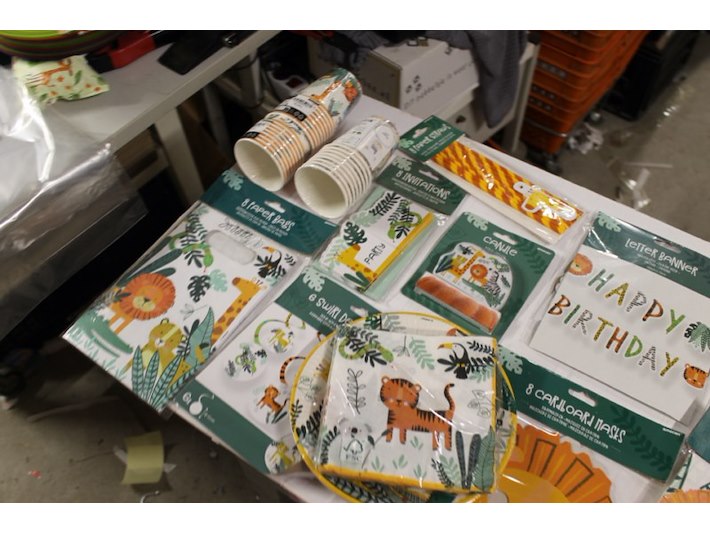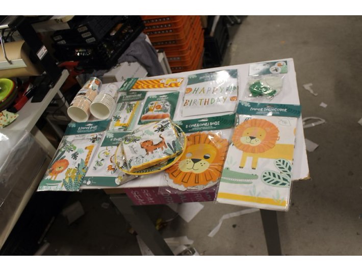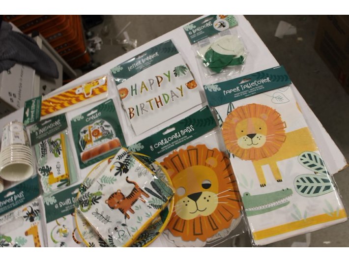 Feestset jungle, 24 bekers, 8 uitdeelzakjes, 8 draai hangdecoratie, 8 uitnodigingen, 1 letterslinger, 1 tafelkleed, 1 kaars, 8 rietjes, 8 bordjes, 16 servetjes, 6 ballonnen, 8 maskers Staat: Nieuw Verzendgewicht: 0.50 Kg.