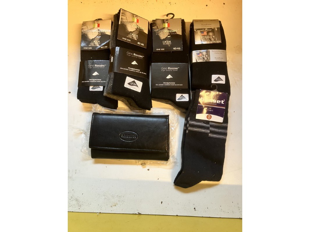 Restje sokken en portemonnee, Staat: Nieuw Verzendgewicht: 0.78 Kg.