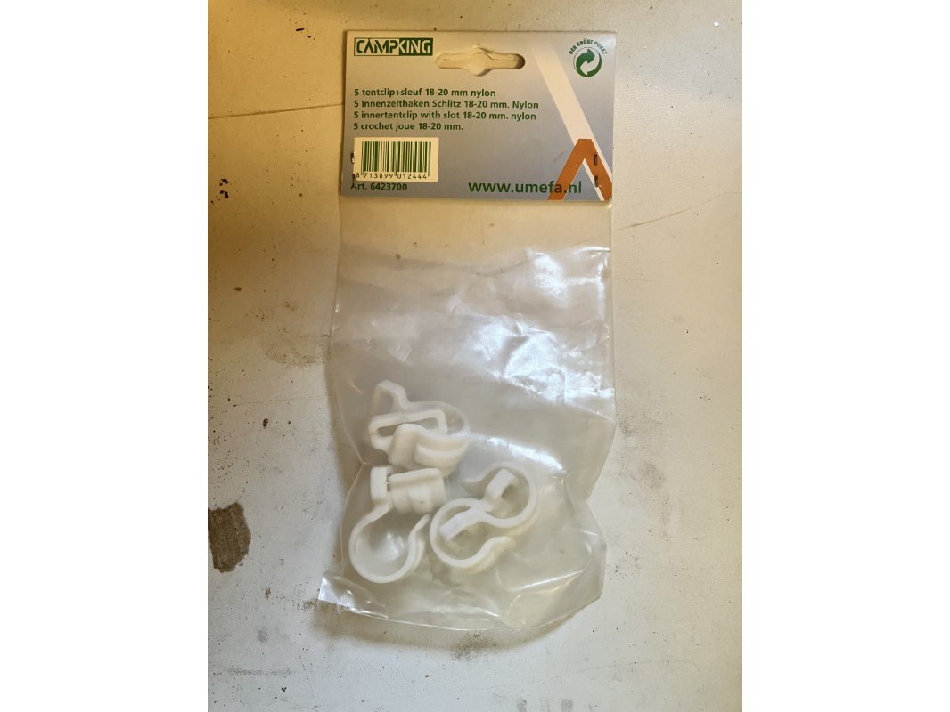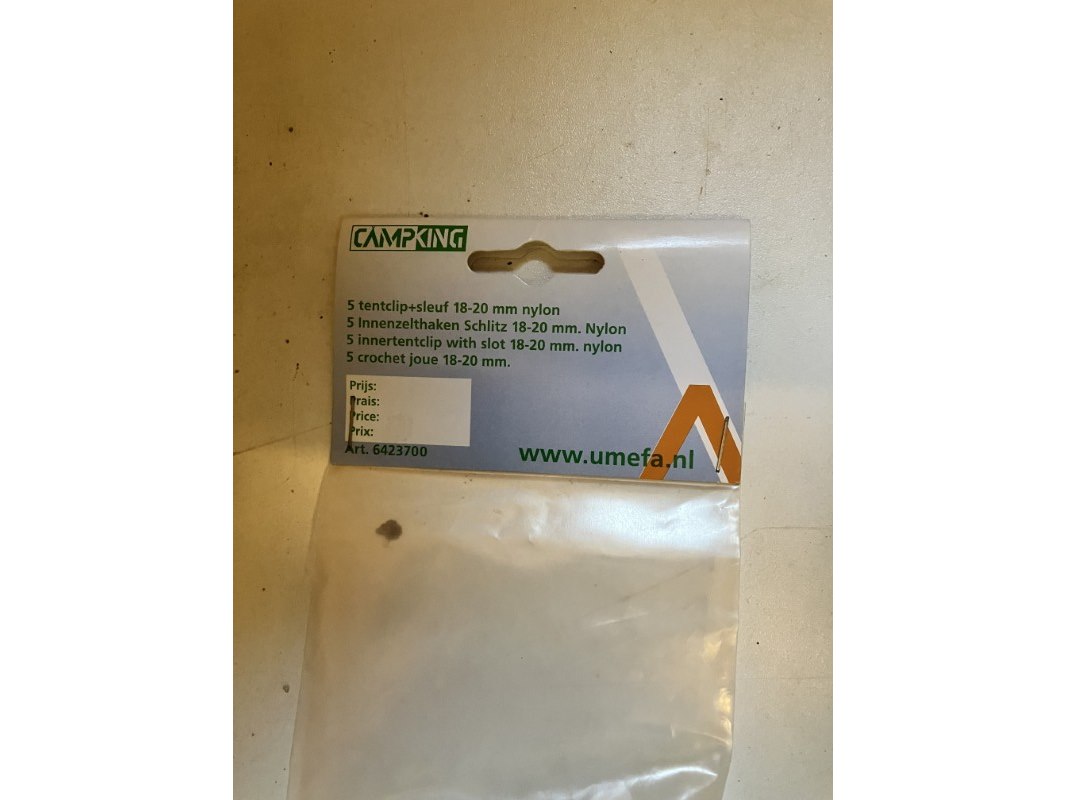6 x zakje met 5 tentclips met sleuf, Staat: Nieuw Verzendgewicht: 0.17 Kg.