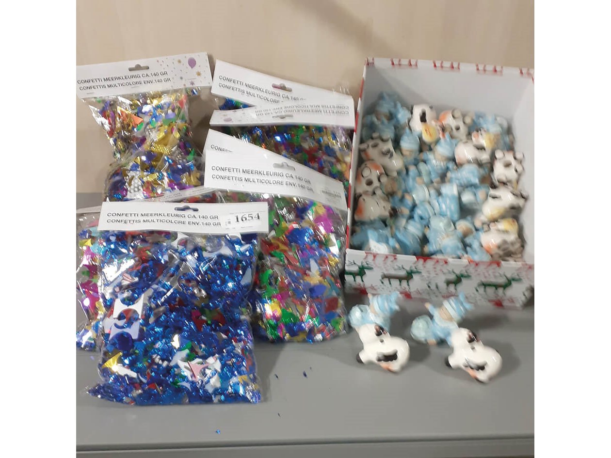 Zakken confetti en doos vol beeldjes Staat: Nieuw Verzendgewicht: 2.00 Kg.