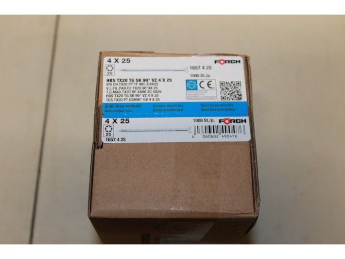 Forch schroeven 4x25 tx20 tg 90 vz 1000st Staat: Nieuw Verzendgewicht: 10.00 Kg.