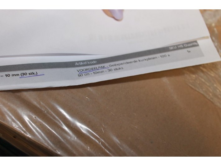 Kurkplaat 30 stuks 1000 mm x 500mm x 10 mm Staat: Nieuw Verzendgewicht: 12.00 Kg.