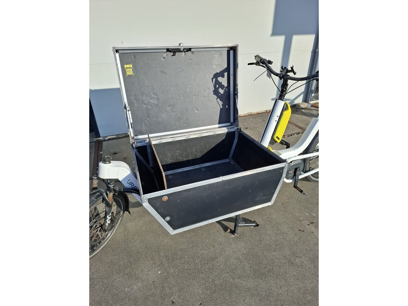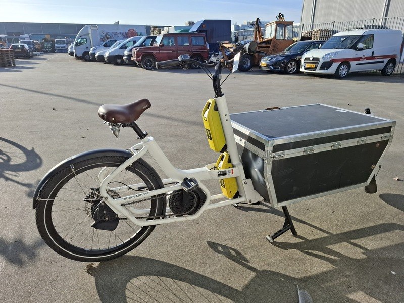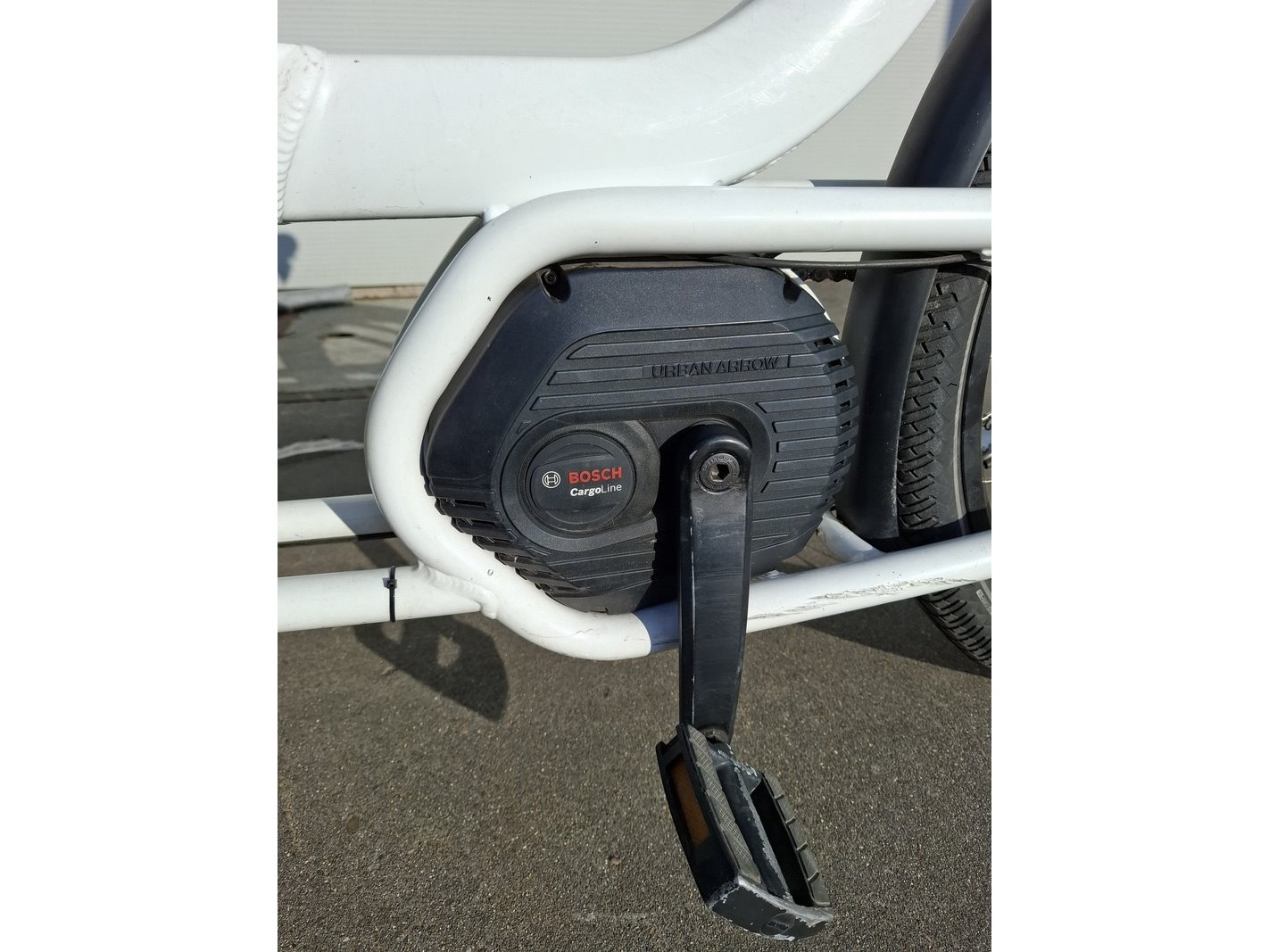 Merk: Urban arrow Product: Bakfiets Kleur: Wit Conditie: Gebruikt Specificaties: Afgelezen tellerstand: 27599 km Framemaat: Ca. 50 cm Voorzien van: - Trapondersteuning, 4 standen - Bandenmaat 26 inch - Schijfremmen, - Geveerde voorvork - Midden motor, Bosch Cargoline