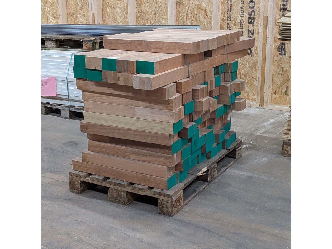 Product: Meranti balk Materiaal: Meranti Afmeting: lengte: ca. 65-75cm, breedte: ca. 12cm, dikte: ca. 7cm Conditie: gebruikt Specificaties: Partij hardhout meranti balkjes aantal: 108 aantal meter aan meranti: 75 M