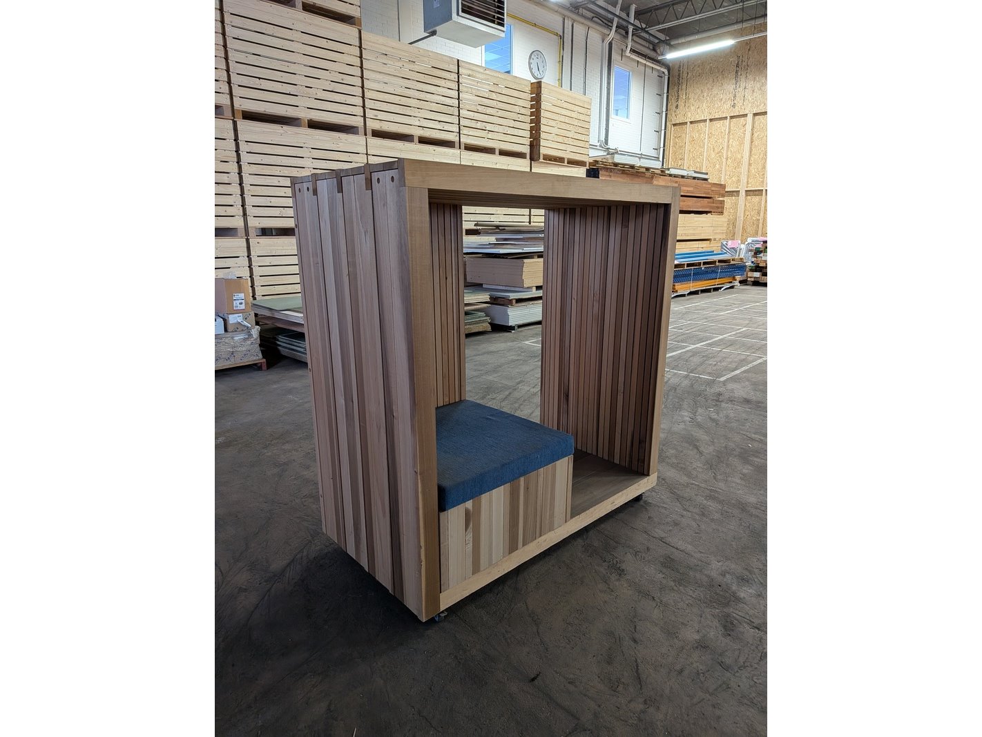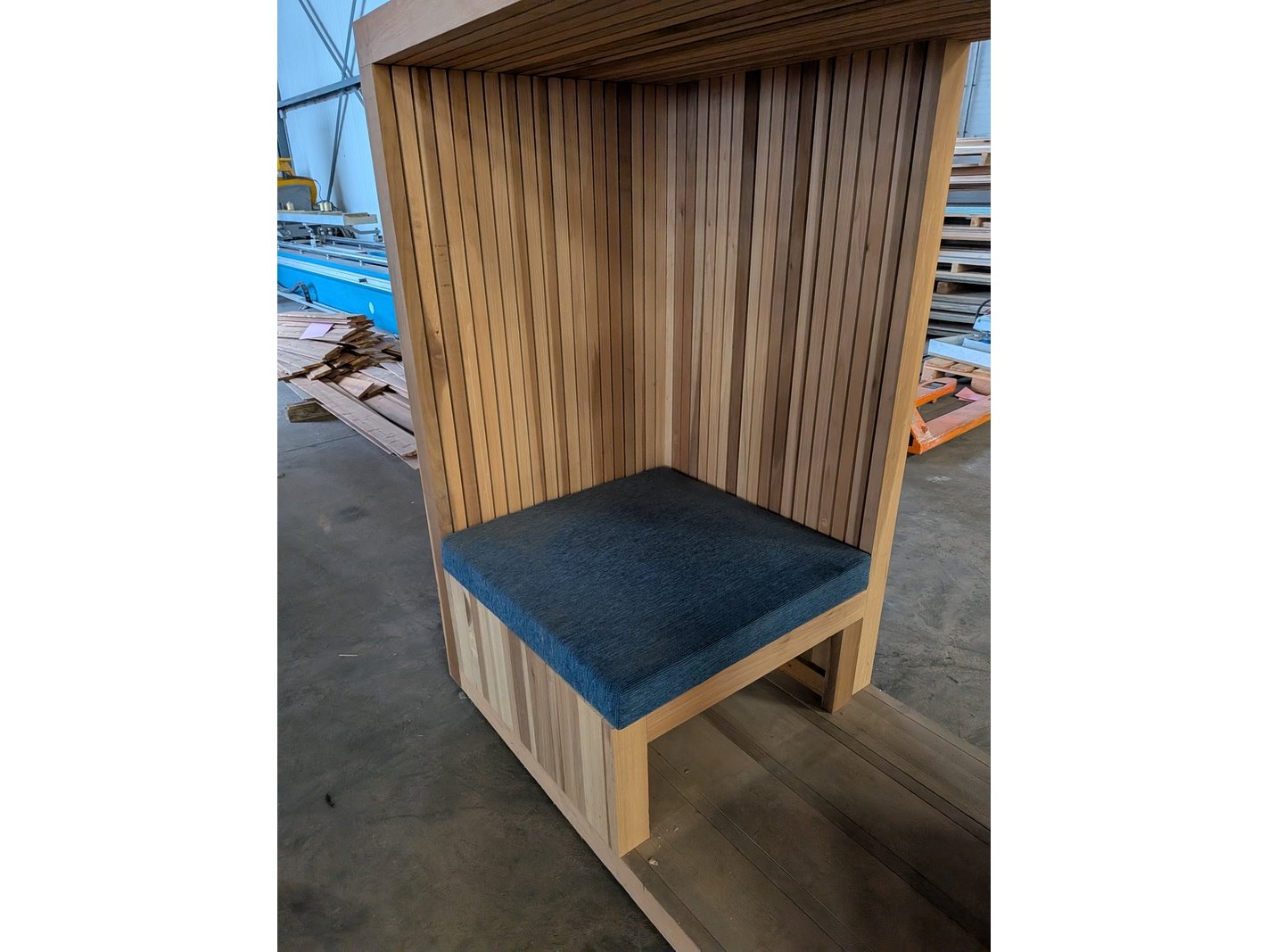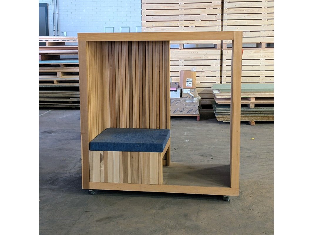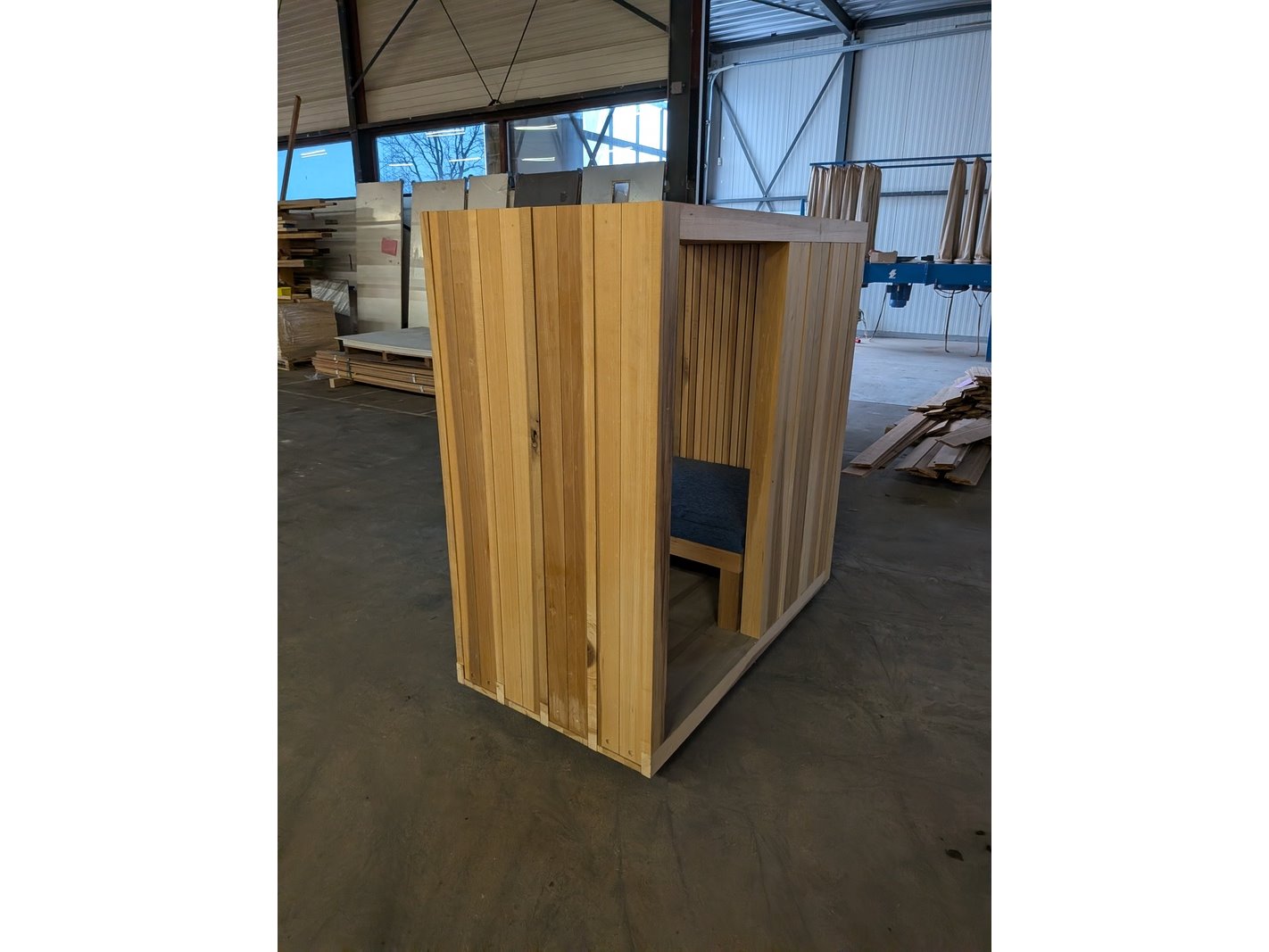 Product: Belhokje / rustruimte Materiaal: hout Afmeting: (bxdxh) ca. 1450x752x1515 Conditie: nieuw Specificaties: belhokje of voor een rust momentje onbehandeld hout