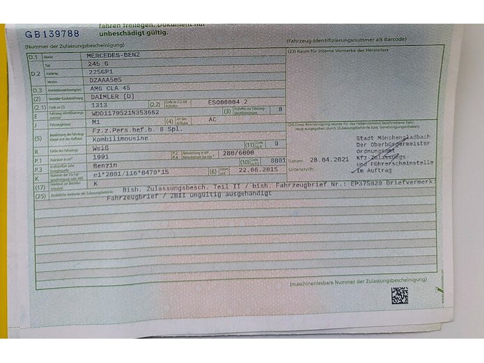Merk: Mercedes-Benz Product: Personenauto BouwJaar: 2015 Conditie: gebruikt Specificaties: Basiskenmerken Kenteken: Duits kenteken VIN-nummer: WDD1179521N353662 Cilinderinhoud: 1991 cc Aantal cilinders: 4 Vermogen: 280 kW Eerste toelating: 22-06-2015 Afgelezen tellerstand: 180120 km Aantal sleutels: 2 Transmissie: Automaat Opties en accessoires AMG Performance Exhaust System Cruise control Airconditioning Elektrisch verstelbare ramen en spiegels Radio / media systeem met display Start / Stop systeem Stuurbediening Bluetooth TCS Waargenomen mankementen Gebruikerssporen Aandachtspunten Het voertuig heeft een Duits kenteken. De koper dient zelf te zorgen voor een nieuw Nederlands kenteken middels een keuring bij RDW. Hier kunnen kosten aan verbonden zijn. Duitse papieren en historie aanwezig. Video https://youtu.be/xVlU42kIFAs