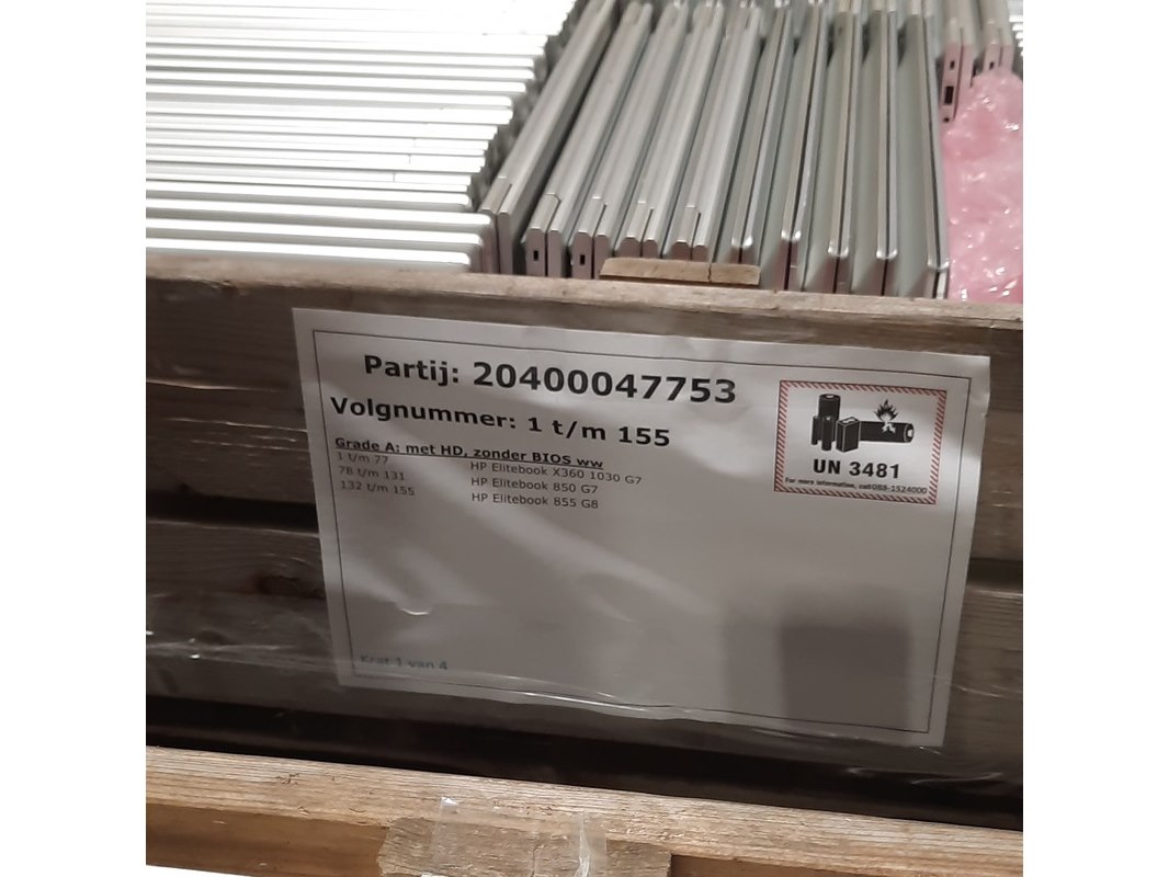 Merk: HP Product: Laptop Conditie: gebruikt Specificaties: Grade B. Met HD, zonder Bios WW 1 t/m 77 - HP Elitebook x360 1030 G7 78 t/m 131 - HP Elitebook 850 G7 132 t/m 155 - HP Elitebook 855 G8