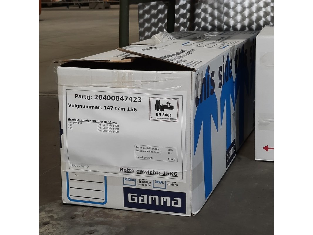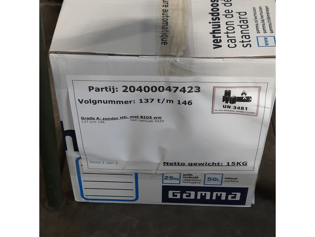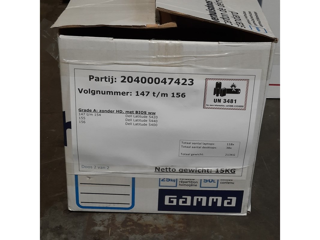 Merk: Dell Product: Laptop Conditie: gebruikt Specificaties: Grade B. Zonder HD, met Bios WW 137 t/m 146 - Dell Latitude 5420 147 t/m 154 - Dell Latitude 5420 155 - Dell Latitude 5440 156 - Dell Latitude 5400
