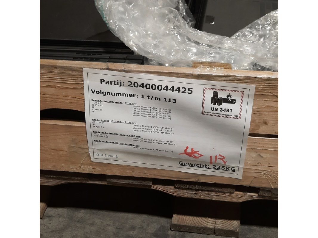 Merk: Lenovo Product: Laptop Conditie: gebruikt Specificaties: Grade B. Met HD, zonder Bios WW 1 t/m 22 - Lenovo Thinkpad L560 25 t/m 30 - Lenovo Thinkpad L570 32 - Lenovo Thinkpad P51 33 t/m 73 - Lenovo Thinkpad X260 76 - Lenovo Thinkpad X270 Met HD, zonder Bios WW 23 t/m 24 - Lenovo Thinkpad L560 31 - Lenovo Thinkpad L570 74 & 75 - Lenovo Thinkpad X260 Zonder HD, zonder Bios WW 77 t/m 106 - Lenovo Thinkpad X270 108 t/m 113 - Lenovo Thinkpad X1 Yoga 107 - Lenovo Thinkpad X270