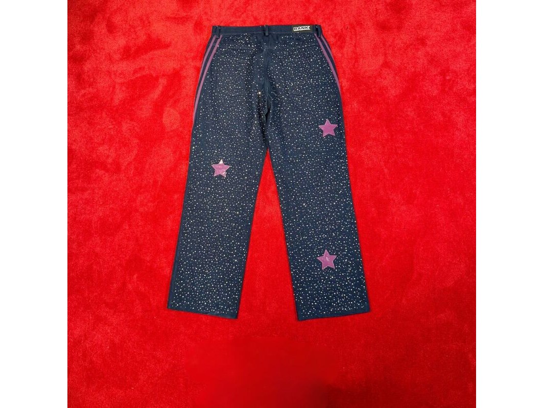 Merk: Bankzitters Product: Broek Kleur: donker blauw/paars Materiaal: Jeans Afmeting: 32 Conditie: gebruikt Specificaties: Custom Glitterbroek met sterren