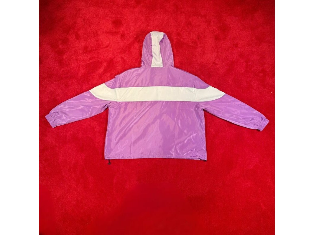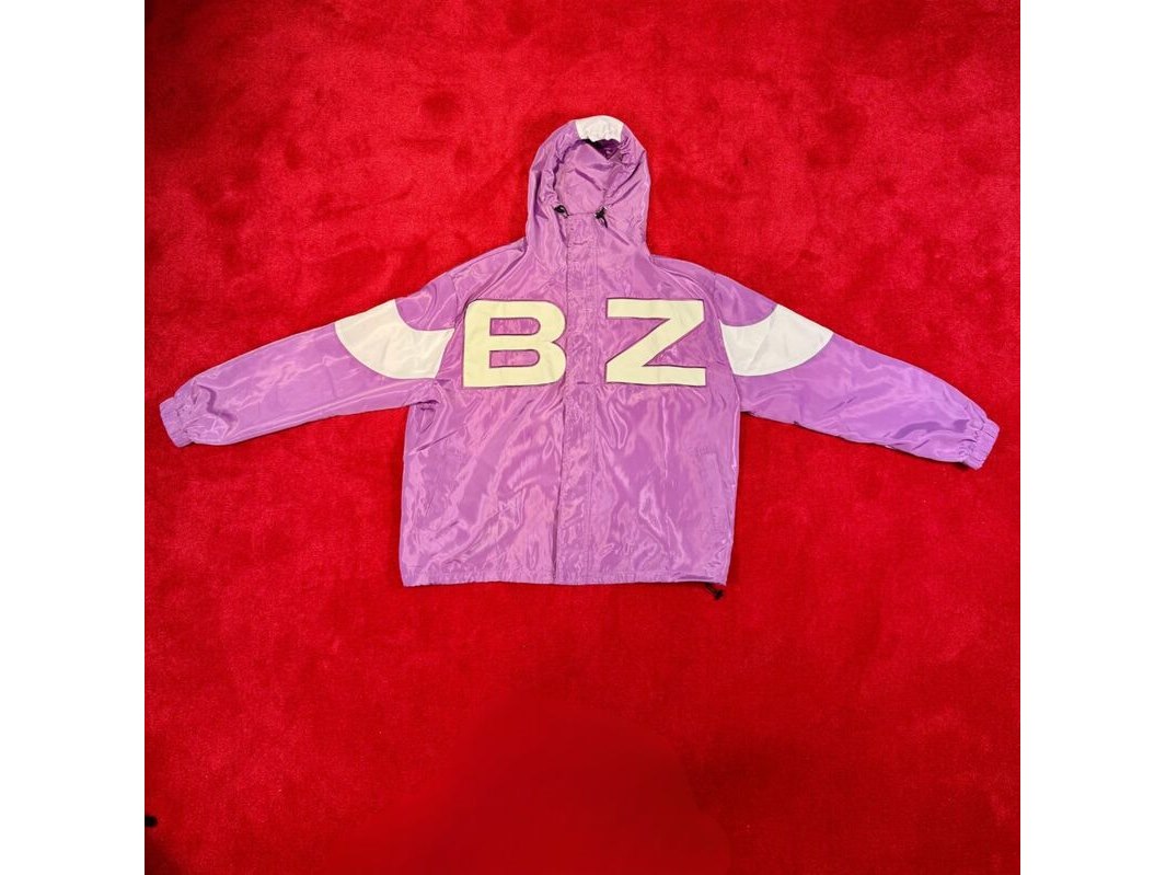 Merk: Bankzitters Product: Jas Kleur: paars Materiaal: Polyester Afmeting: XL Conditie: gebruikt Specificaties: Custom windbreaker met glow in the dark branding