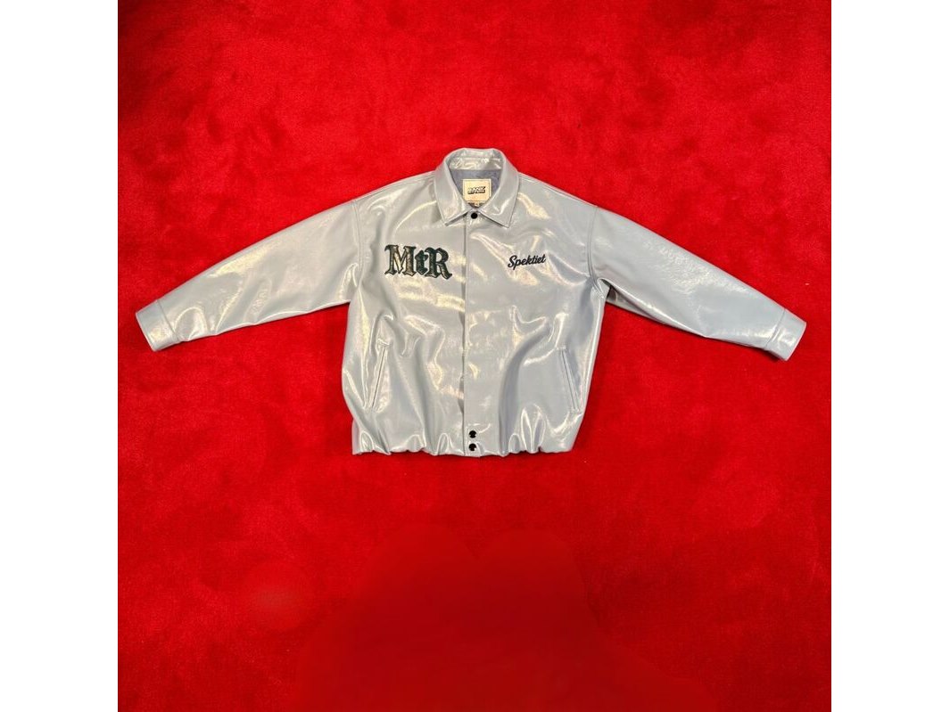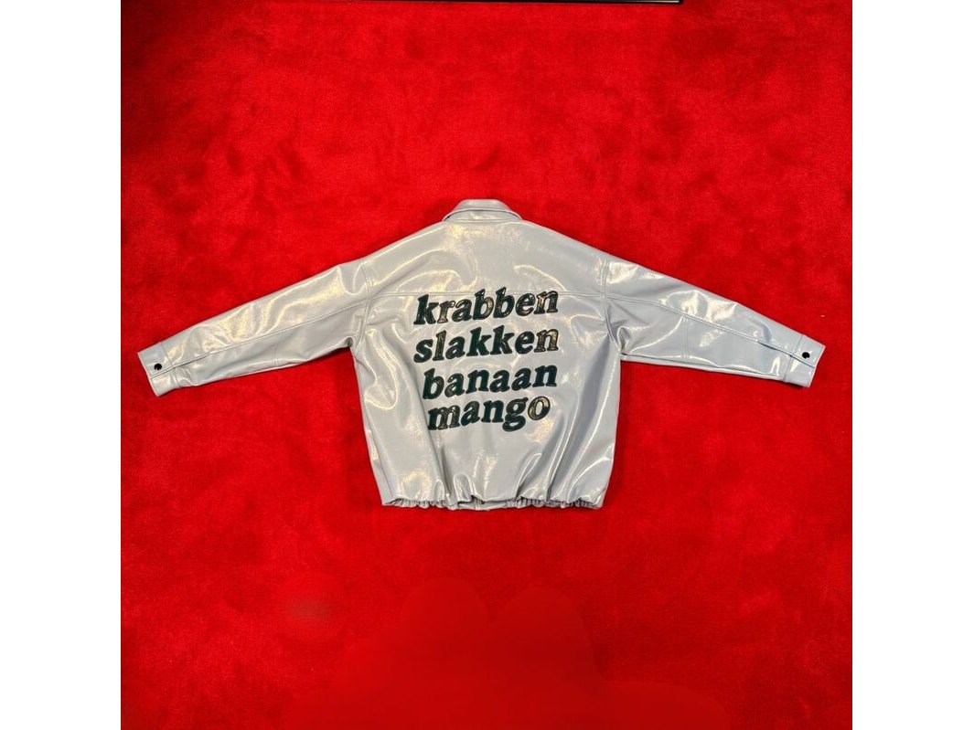 Merk: Bankzitters Product: Jas Kleur: lichtblauw Materiaal: PU leather Afmeting: XL Conditie: gebruikt Specificaties: Custom leren jas met leren branding (all-ages)