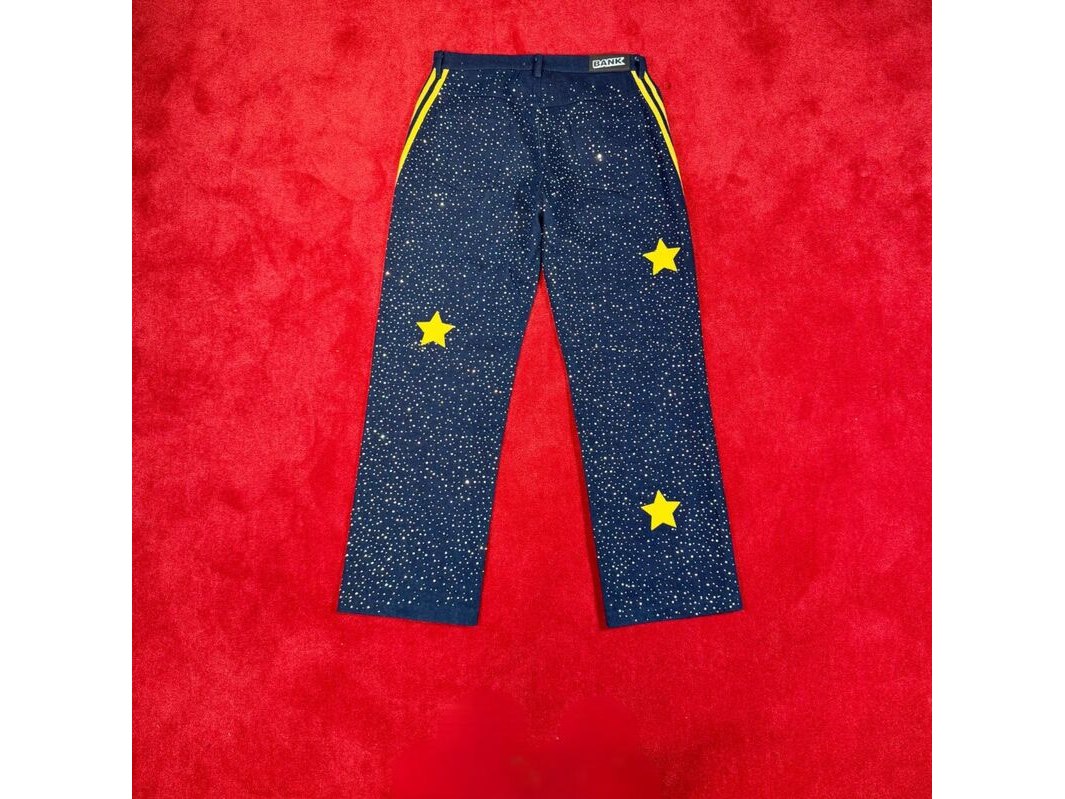 Merk: Bankzitters Product: Broek Kleur: geel Materiaal: Jeans Afmeting: 32 Conditie: gebruikt Specificaties: Custom Glitterbroek met sterren
