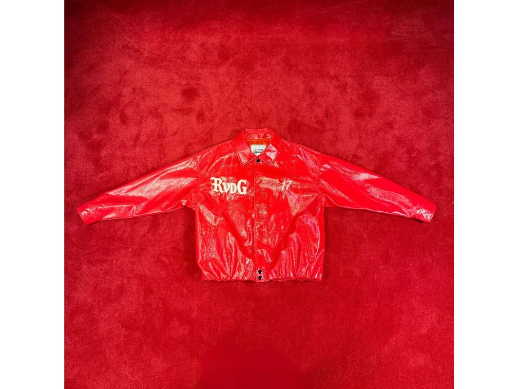 Merk: Bankzitters Product: Jas Kleur: rood Materiaal: PU leather Afmeting: M Conditie: gebruikt Specificaties: Custom leren jas met leren branding