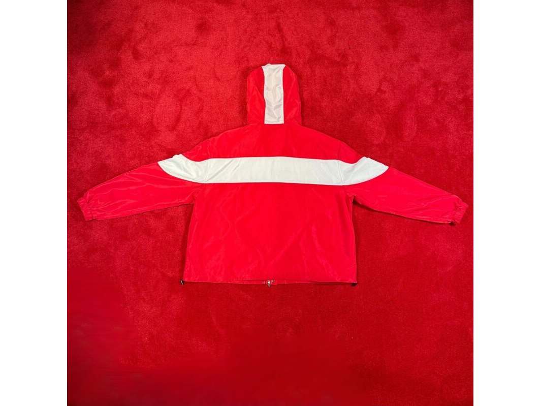 Merk: Bankzitters Product: Jas Kleur: rood Materiaal: Polyester Afmeting: L Conditie: gebruikt Specificaties: Custom windbreaker met glow in the dark branding