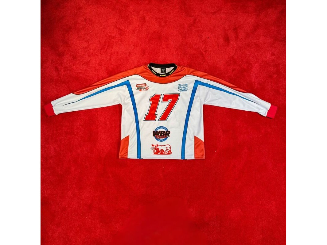 Merk: Bankzitters Product: Jersey Kleur: rood, wit Materiaal: Polyester Afmeting: M Conditie: gebruikt Specificaties: Custom racingtop met hoge kraag