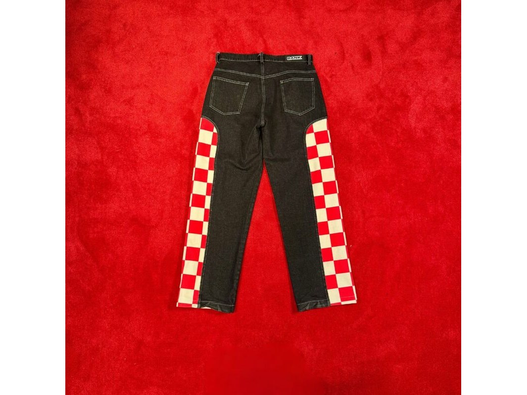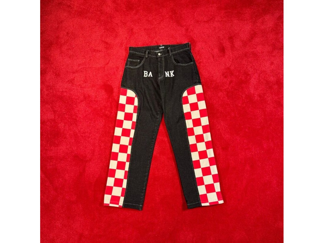 Merk: Bankzitters Product: Broek Kleur: zwart Materiaal: Jeans Afmeting: 30 Conditie: gebruikt Specificaties: Custom jeans met geblokte panneling