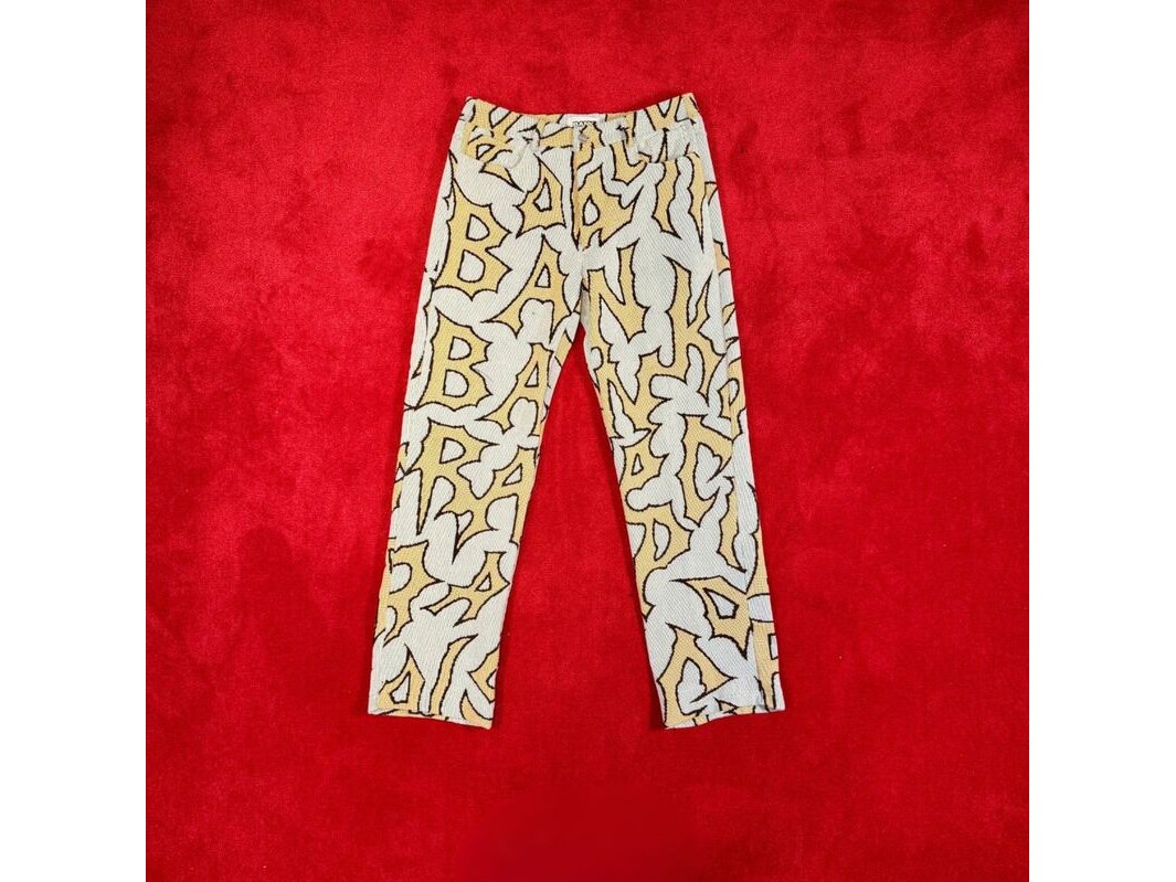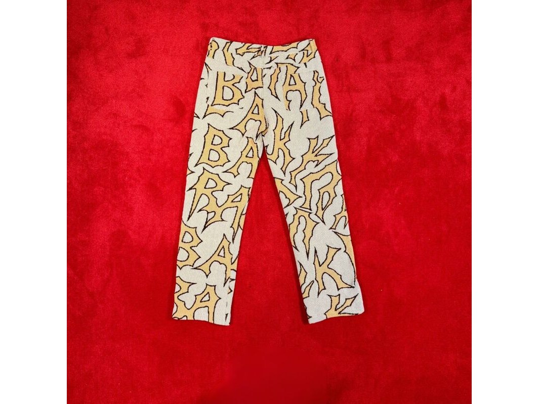 Merk: Bankzitters Product: Broek Kleur: Blauw Materiaal: Katoen Afmeting: L Conditie: gebruikt Specificaties: Custom tapestry broek (volledig geweven)