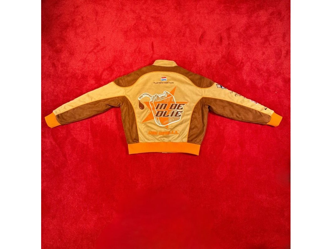 Merk: Bankzitters Product: Jas Kleur: Beige Materiaal: Suède Afmeting: Xl Conditie: gebruikt Specificaties: Custom racejas in suède met borduring