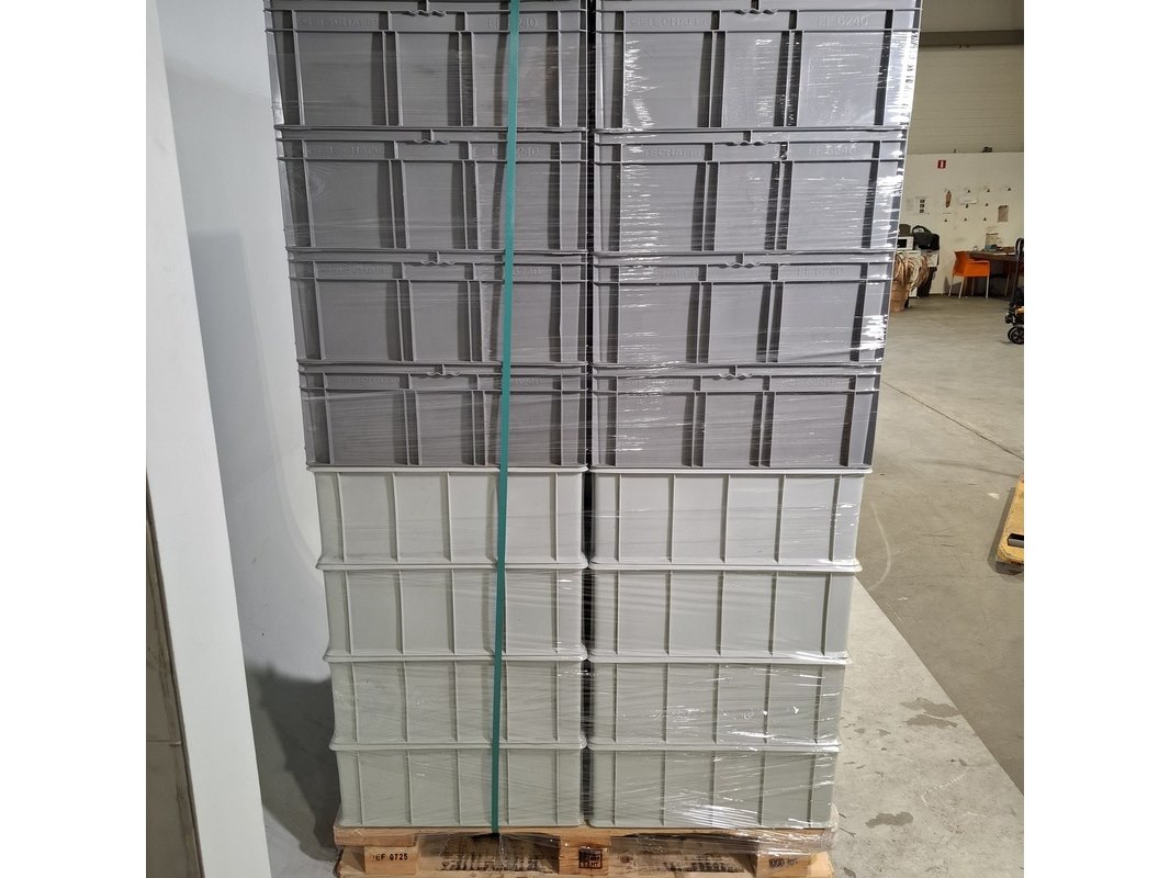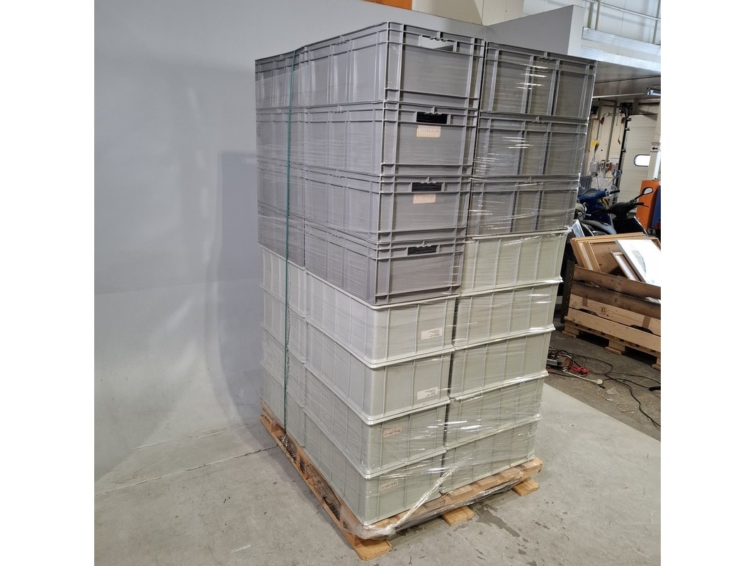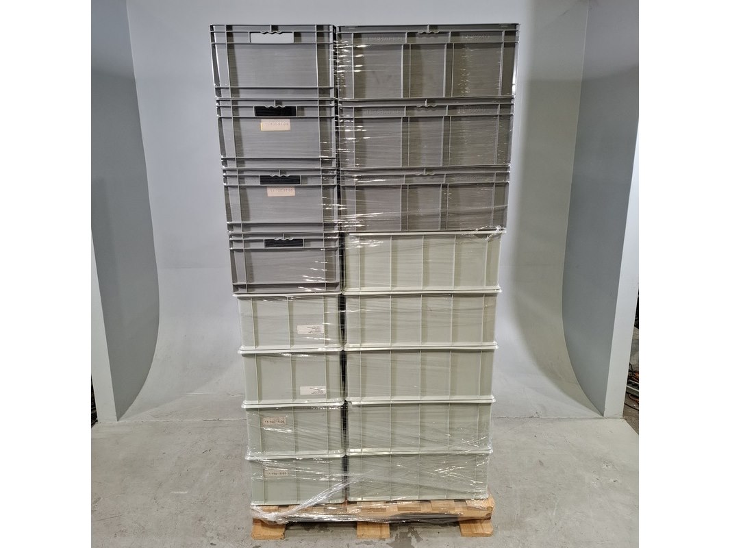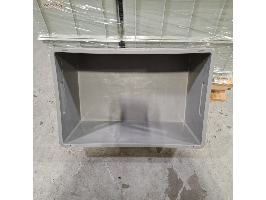 Product: Partij kunststof bakken Afmeting: LxBxH ca. 59x39x24 cm. Conditie: gebruikt Specificaties: De bakken hebben diverse beschadigingen. Exclusief pallet.