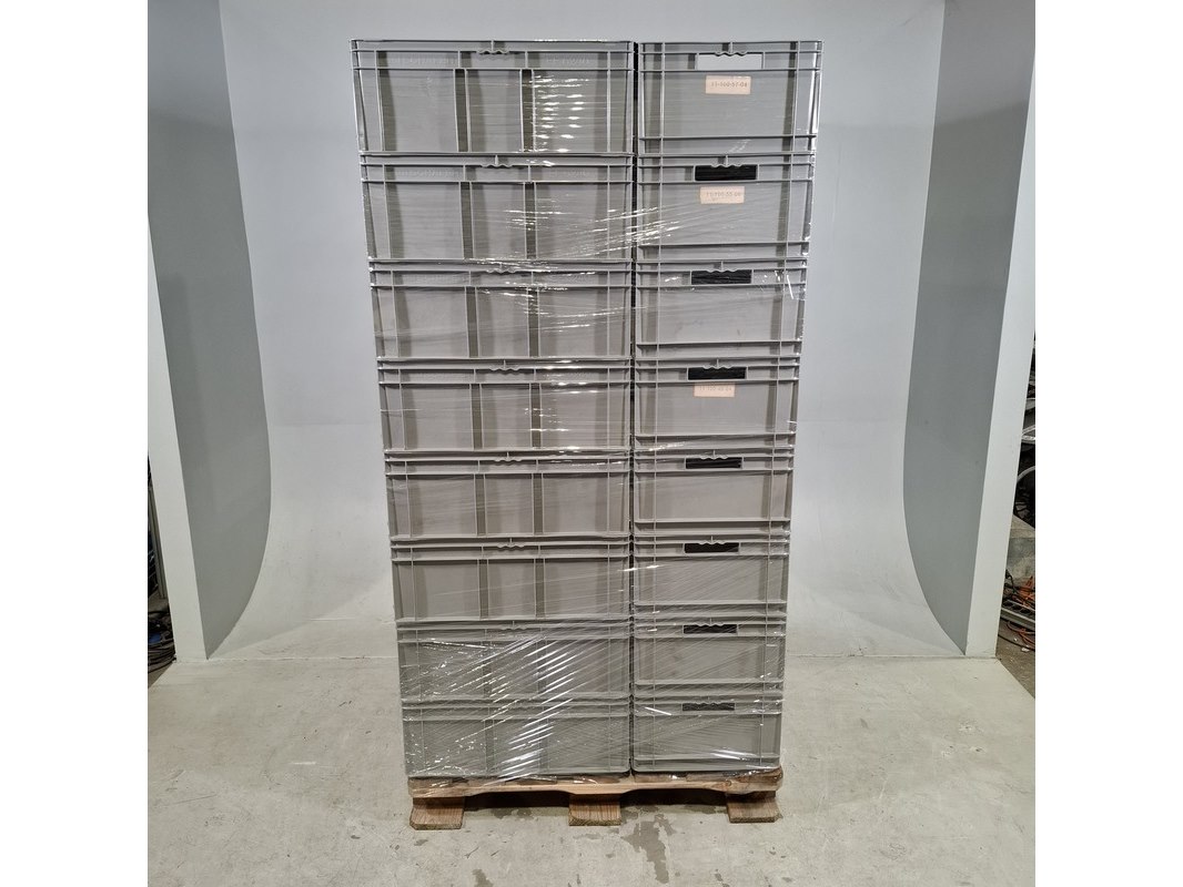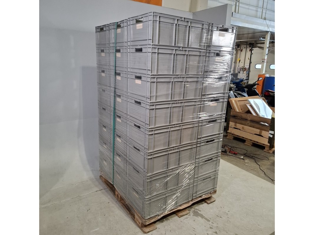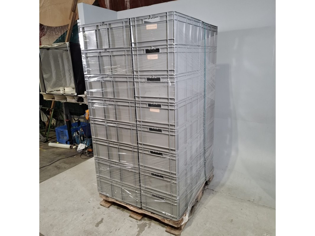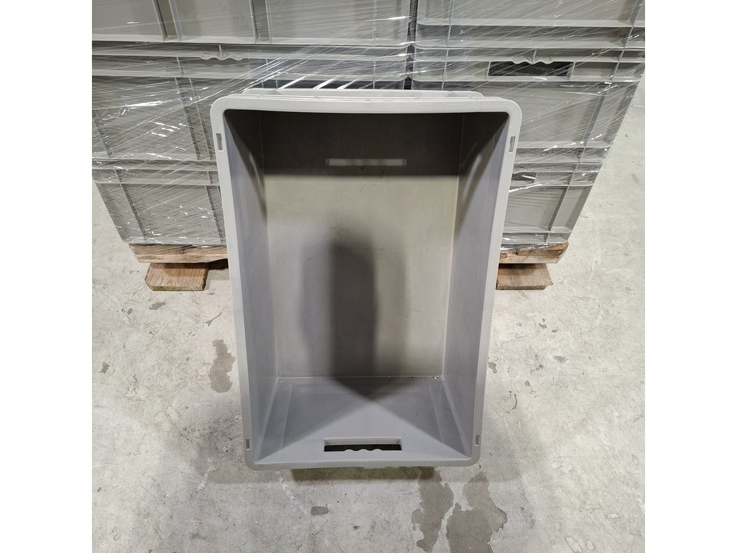 Product: Partij kunststof bakken Afmeting: LxBxH ca. 59x39x24 cm. Conditie: gebruikt Specificaties: De bakken hebben diverse beschadigingen. Exclusief pallet.