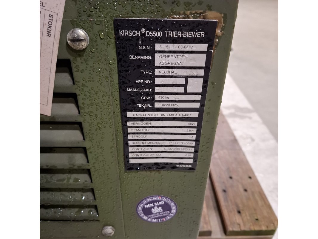 Merk: Kirsch Product: Aggregaat Afmeting: LxBxH ca. 142x66x85 cm. BouwJaar: 1993 Conditie: gebruikt Specificaties: 6 kW Gewicht ca. 430 Kg. 32A Exclusief sleutels Technische staat en compleetheid onbekend Exclusief pallet