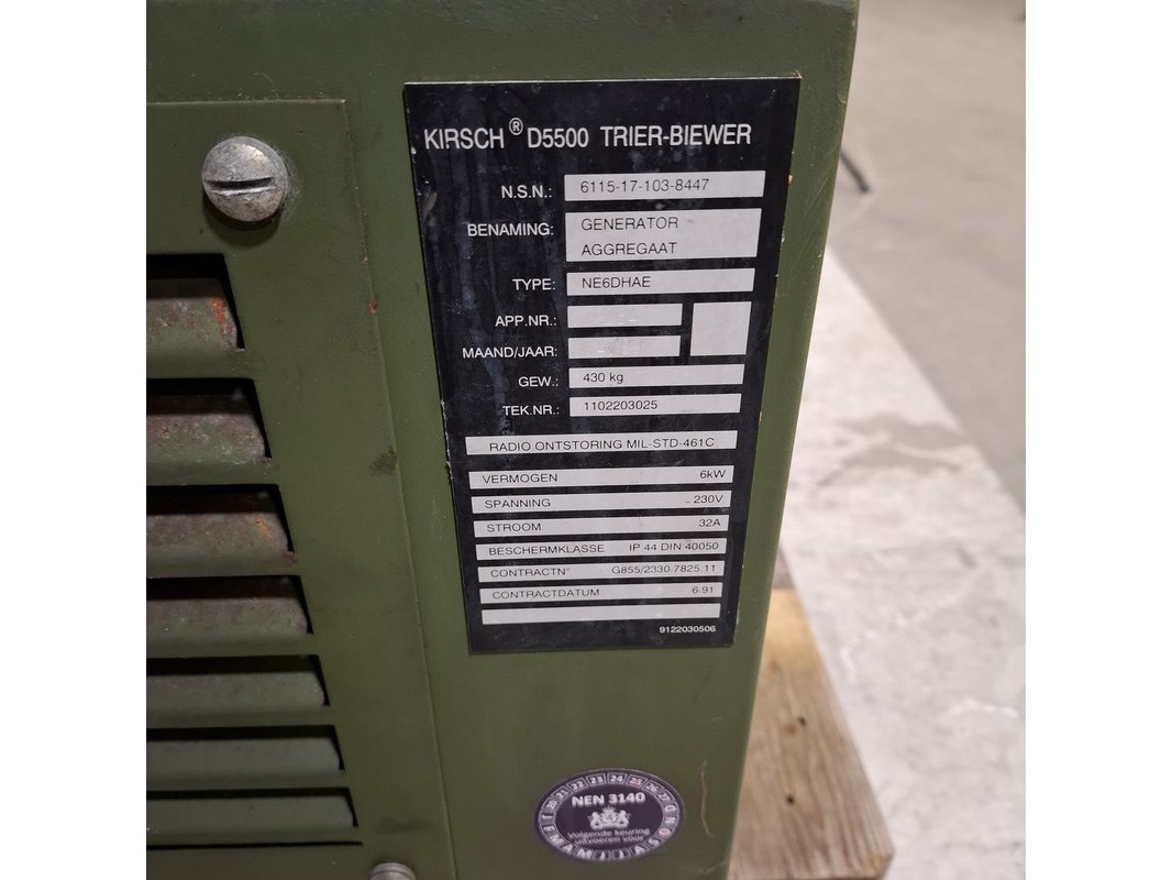 Merk: Kirsch Product: Aggregaat Afmeting: LxBxH ca. 142x66x85 cm. BouwJaar: 1993 Conditie: gebruikt Specificaties: 6 kW Gewicht ca. 430 Kg. 32A Exclusief sleutels Technische staat en compleetheid onbekend Exclusief pallet