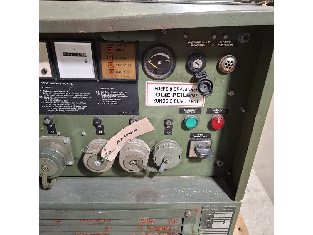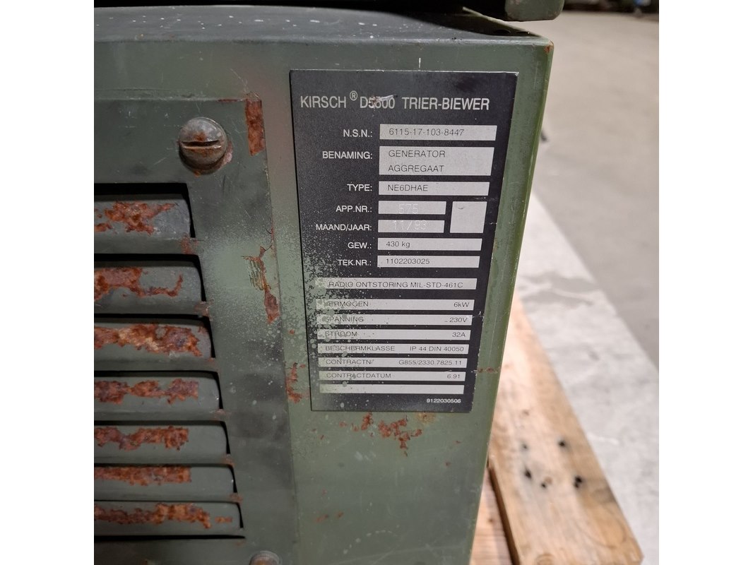 Merk: Kirsch Product: Aggregaat Afmeting: LxBxH ca. 142x66x85 cm. BouwJaar: 1993 Conditie: gebruikt Specificaties: 6 kW Gewicht ca. 430 Kg. 32A Exclusief sleutels Technische staat en compleetheid onbekend Exclusief pallet
