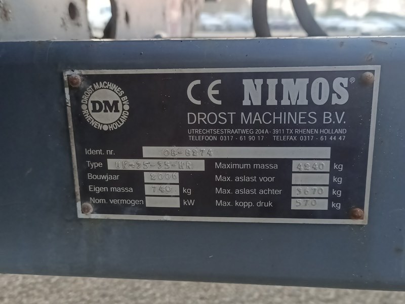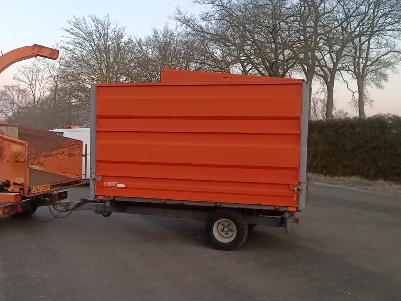 Merk: NIMOS Product: Houtsnipper kipwagen Afmeting: afmeting laadvloer (LxBxH): ca. 3.050 x 1.500 x 1.600 mm BouwJaar: 2006 Conditie: Gebruikt Specificaties: Basiskenmerken Kenteken: LNL-19-K Serienummer: 08-8274 Datum eerste toelating: 30 juni 2006 Technische gegevens Eigen massa: 740 kg Max. massa: 4.240 kg Max. aslast achter: 3.670 kg Max. koppelingsdruk: 670 kg Afmetingen laadvloer (LxBxH) : ca. 3.050 x 1.500 x 1.600 mm