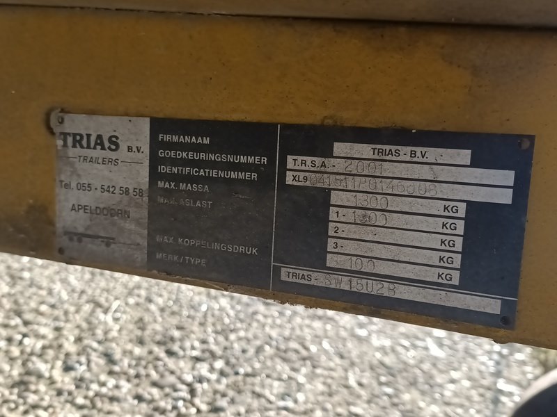 Merk: TRIAS Product: Actiewagen BouwJaar: 2004 Conditie: Gebruikt Specificaties: Basiskenmerken Kenteken: WN-LD-82 Goedkeuringsnummer: T.R.S.A.-2001 Identificatienummer: XL9041511P0146008 Datum eerste toelating: 4 juni 2004 Maten & Gewichten Lengte: 4.620 mm Breedte: 1.710 mm Massa rijklaar: 980 kg Max. massa: 1.300 kg Laadvermogen: 320 kg