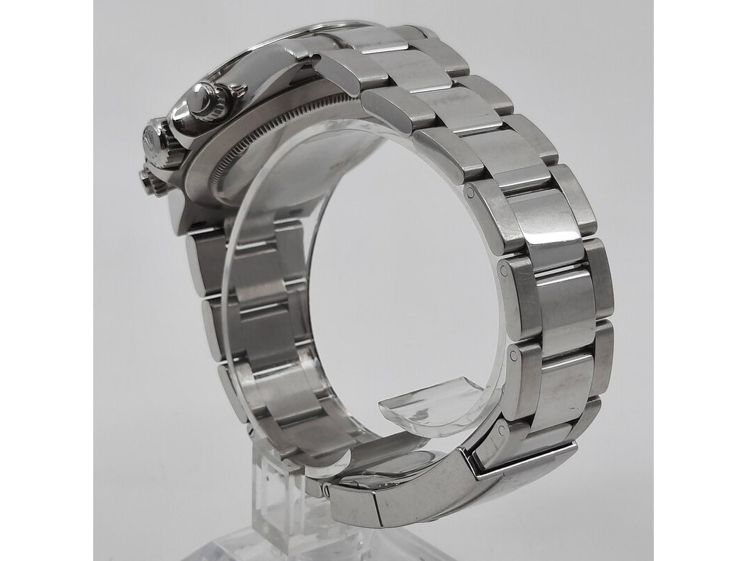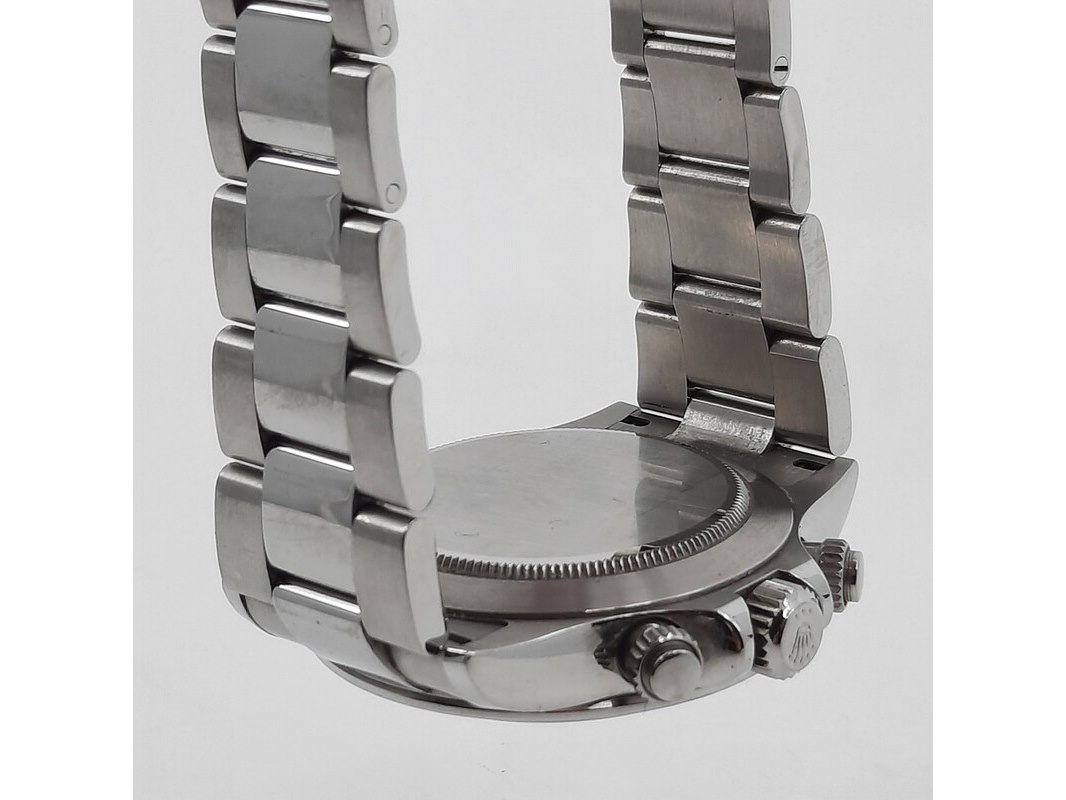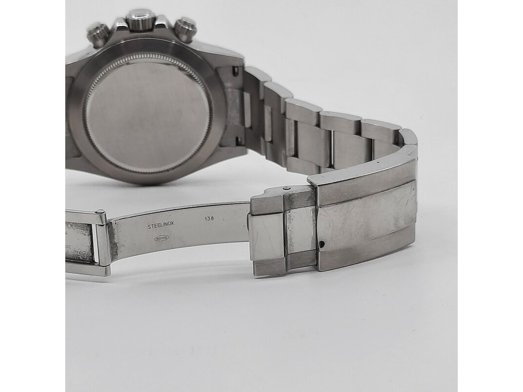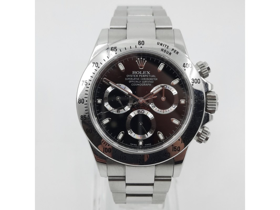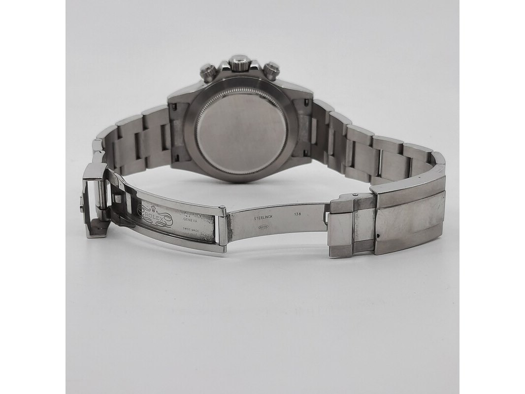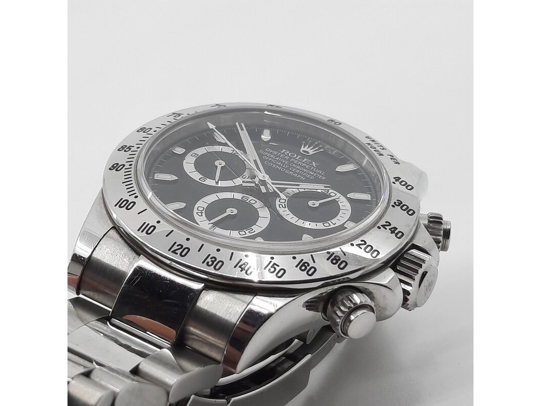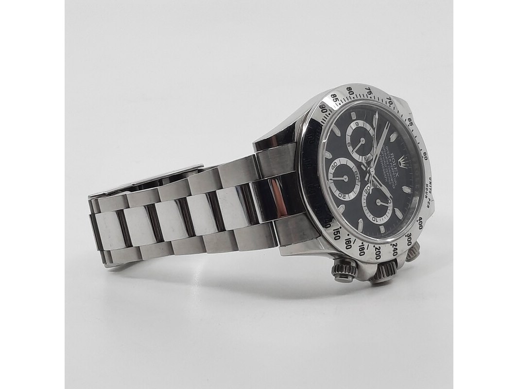 Merk: Rolex Product: Heren polshorloge Conditie: gebruikt Specificaties: Een stalen heren polshorloge, Rolex Daytona 116520. Met zwarte wijzerplaat, zwarte registers en stalen band met vouwsluiting. Geen doos en geen certificaat.