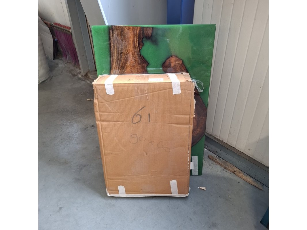 Product: Epoxy tafel groen 90x60cm Materiaal: Suar walnut epoxy BouwJaar: 2025 Conditie: Nieuw Specificaties: Incl. set u poten, te monteren met houtdraaibouten.