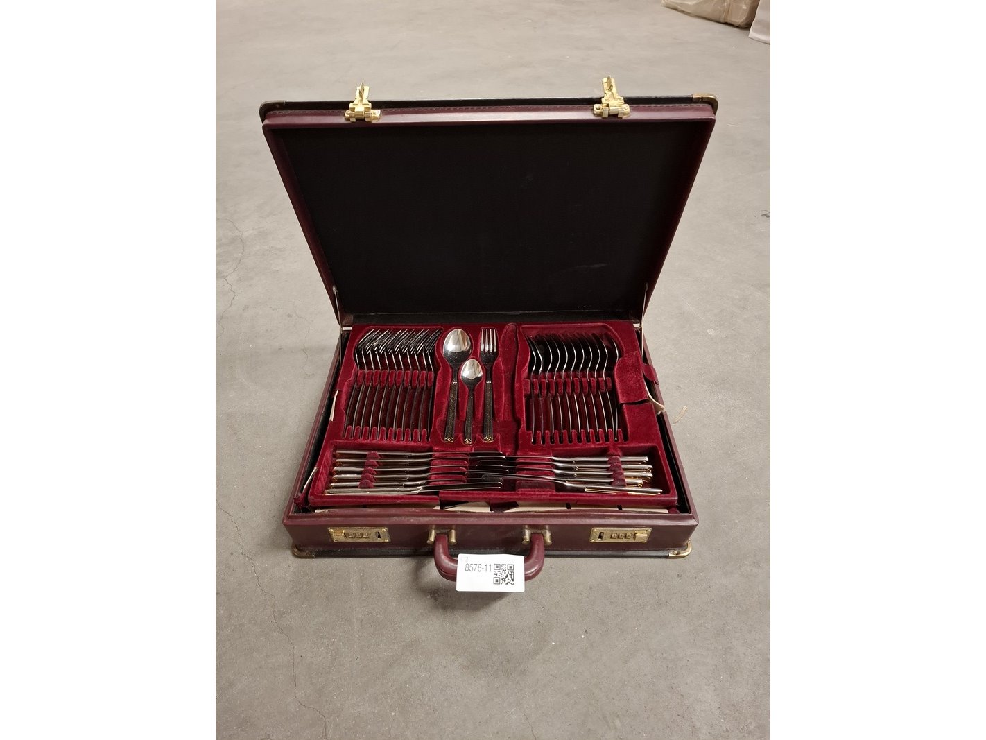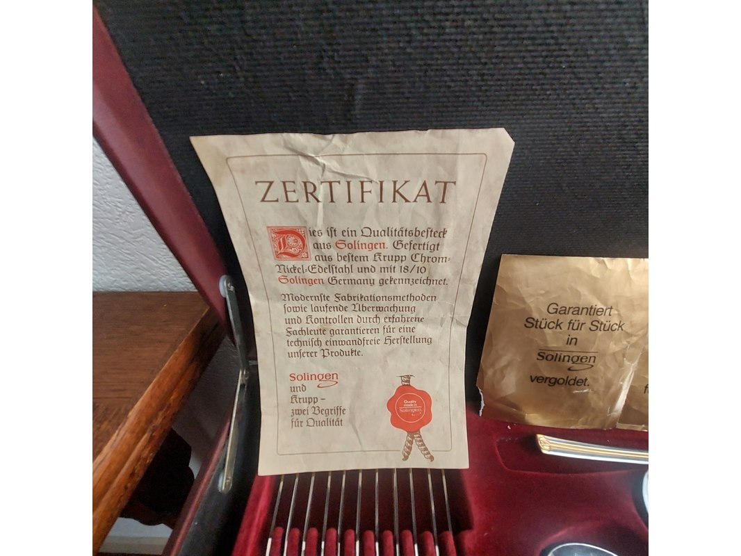 Merk: Nivella Solingen Product: Bestek set Conditie: Gebruikt Specificaties: Dit is een Nivella Solingen bestek set, compleet geleverd in de originele koffer. Nivella besteksets uit Solingen, Duitsland, staan bekend om hun kwaliteit en vakmanschap. Product details Merk: Nivella Solingen Herkomst: Solingen, Duitsland, een stad die een beschermd handelsmerk heeft voor zijn messen en bestek ("City of Blades"). Materiaal: De sets zijn doorgaans gemaakt van 18/10 chroom-nikkel roestvrij staal. Afwerking: Veel van deze sets, zoals deze op de foto, zijn (gedeeltelijk of volledig) verguld met 23/24-karaats goud. Inhoud: De sets bestaan vaak uit 70 tot 72 delen en zijn geschikt voor 12 personen, inclusief diverse opscheplepels en bestek. Certificaat: De set wordt geleverd met een certificaat van echtheid, zoals te zien is in de koffer.
