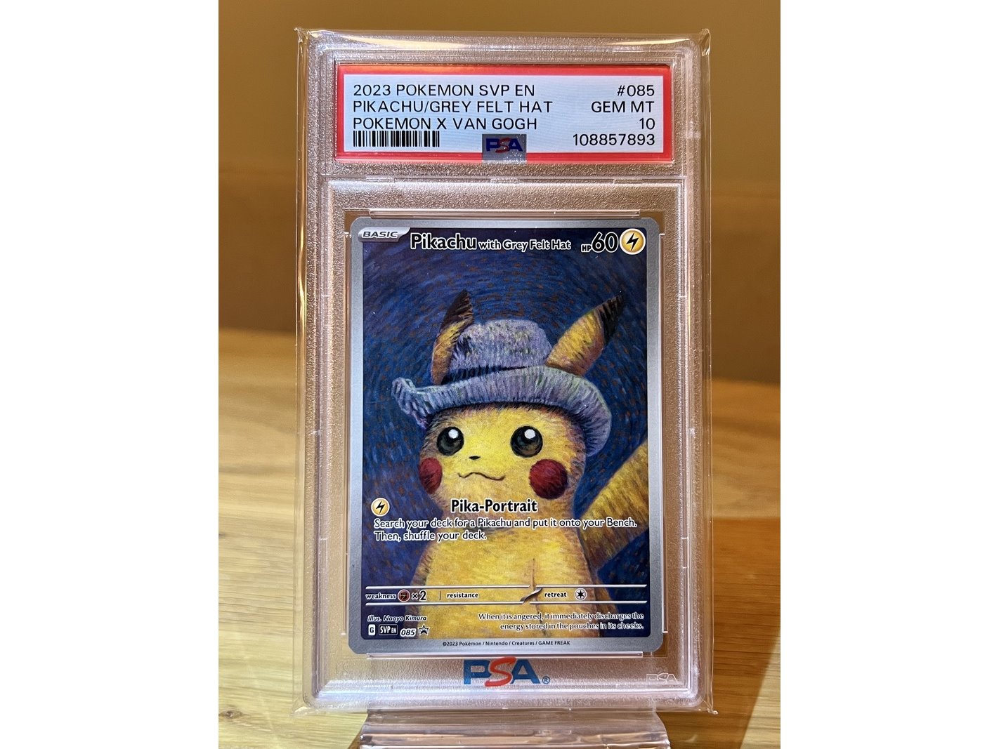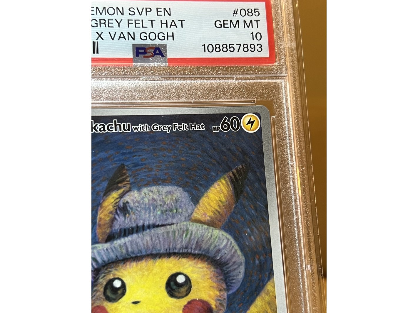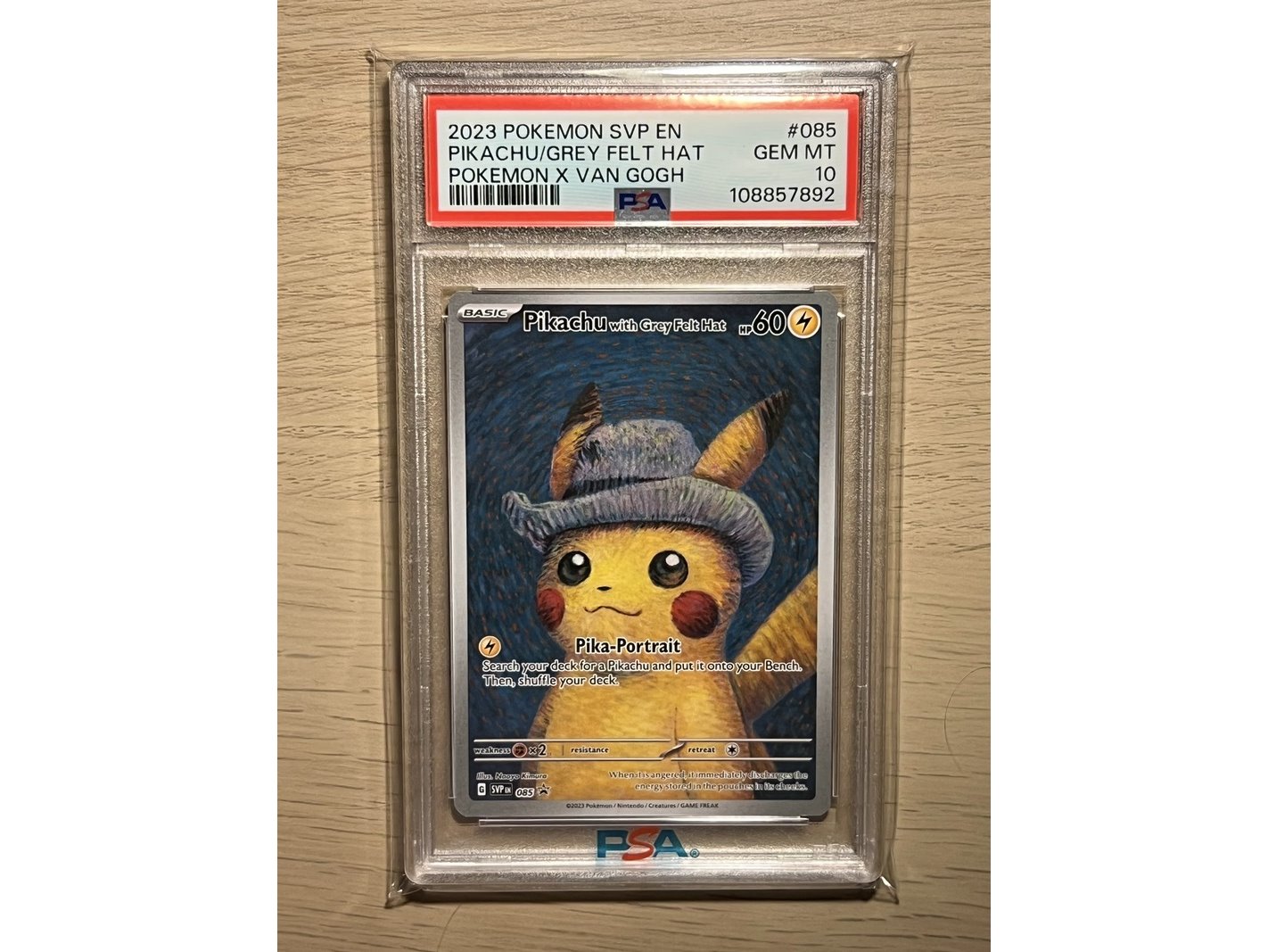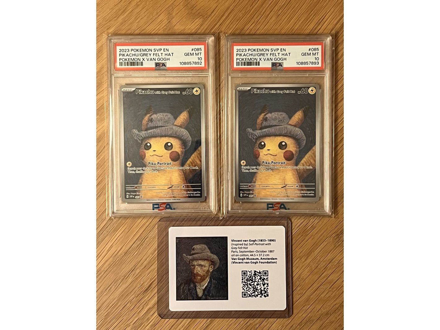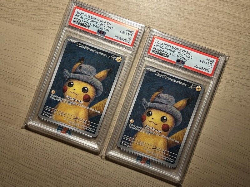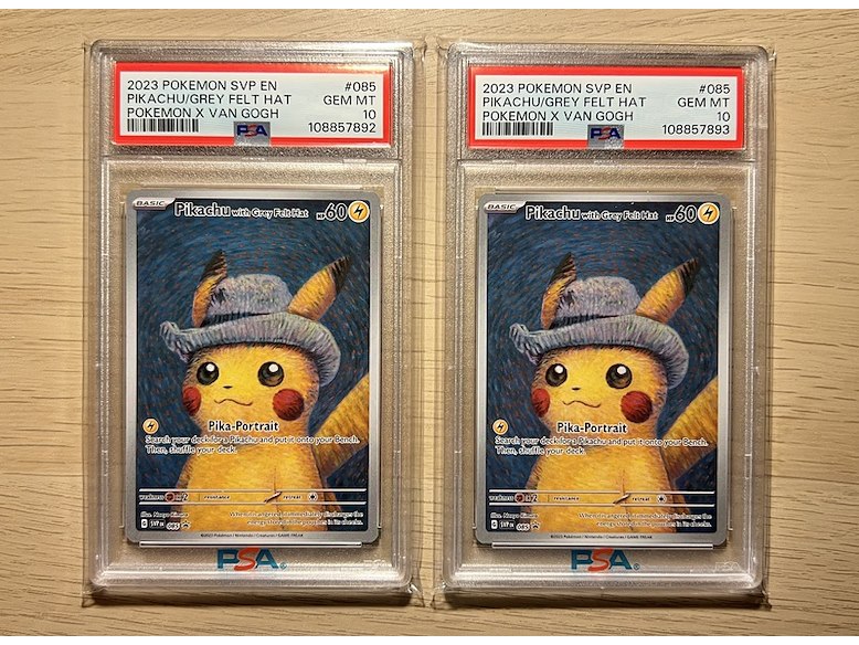 Specificaties: 2x Pikachu with grey Felt Hat 085 van Gogh PSA 10 - Pokemon Aangeboden: 2x de felbegeerde Pikachu van Gogh kaart in een Gem Mint PSA 10. 2x Pikachu van Gogh PSA 10 Oplopende certs 1x van Gogh QR kaart Slabs in PSA sleeves Op echtheid gecontroleerd. De illustratie toont Pikachu met een grijze vilten hoed, geïnspireerd op Vincent van Gogh’s beroemde schilderij Self-Portrait with Grey Felt Hat uit 1887. Deze Pikachu kaart is een unieke samenwerking tussen The Pokémon Company International en het Van Gogh Museum. Sinds zijn release laat deze gewilde kaart een flinke waardestijging zien. Met het 30 jarige bestaan van Pokemon een mooie toevoeging aan je collectie.