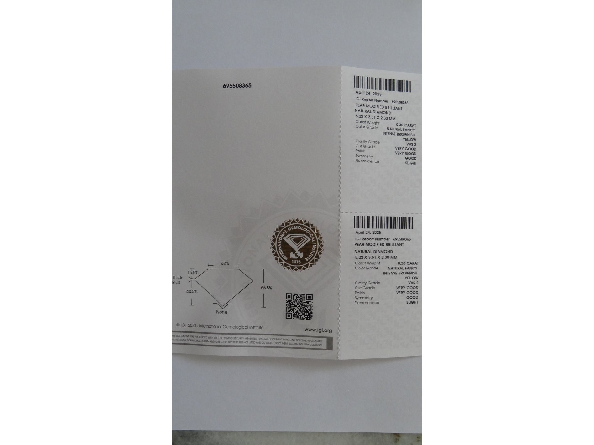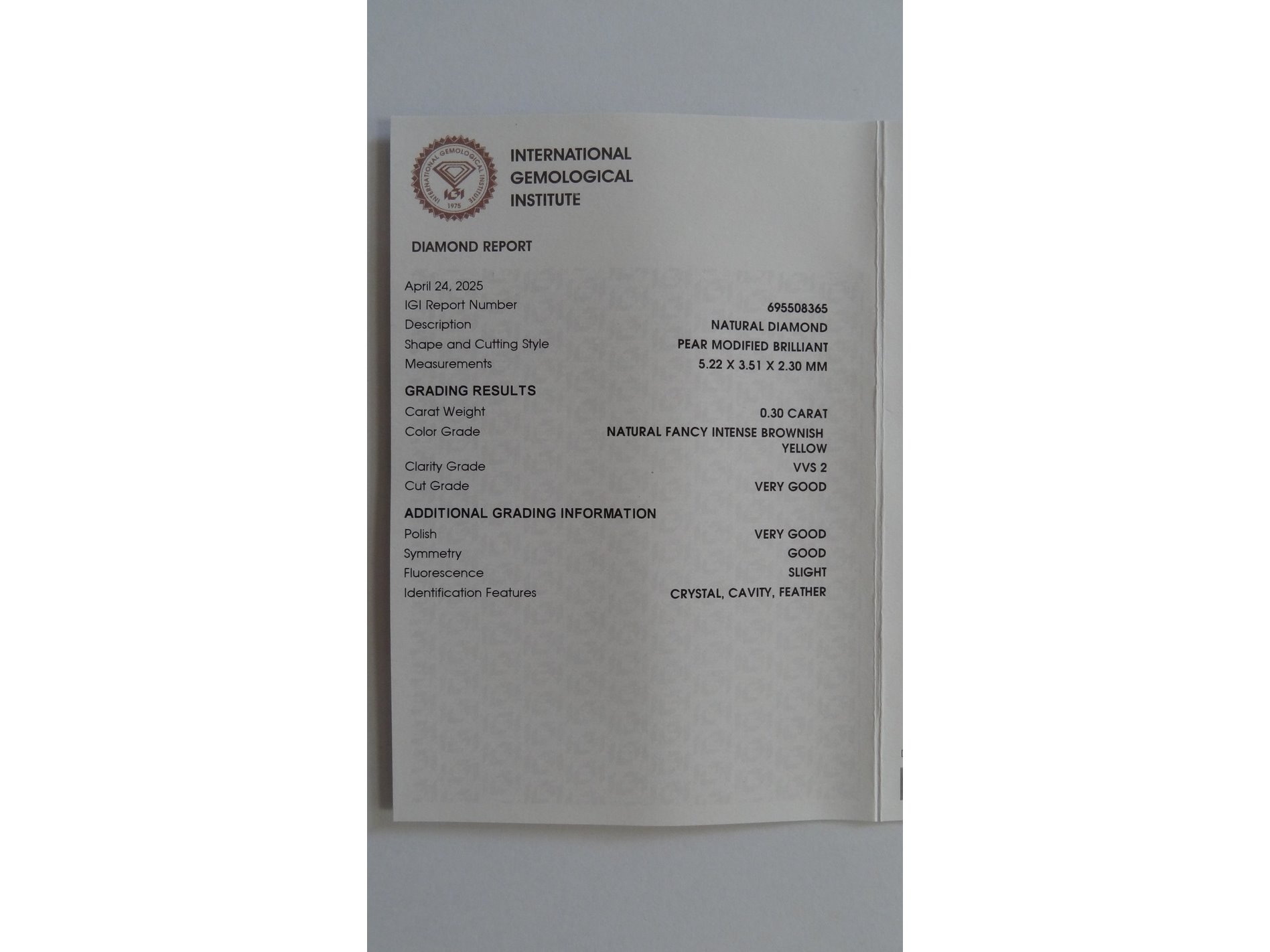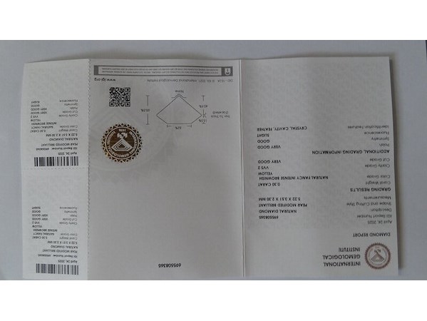 Product: Natural diamond | 0.30ct ( IGI Gecertificeerd ) Conditie: Nieuw Specificaties: Natural diamond. Weight : 0.30 ct. Shape : Pear modified brilliant. Color : Fancy intence brownish yellow. Clarity : VVS 2 Sealed : Ja Dimensions : 5.22 x 3.51 x 2.30 mm Compleet met IGI certificaat.
